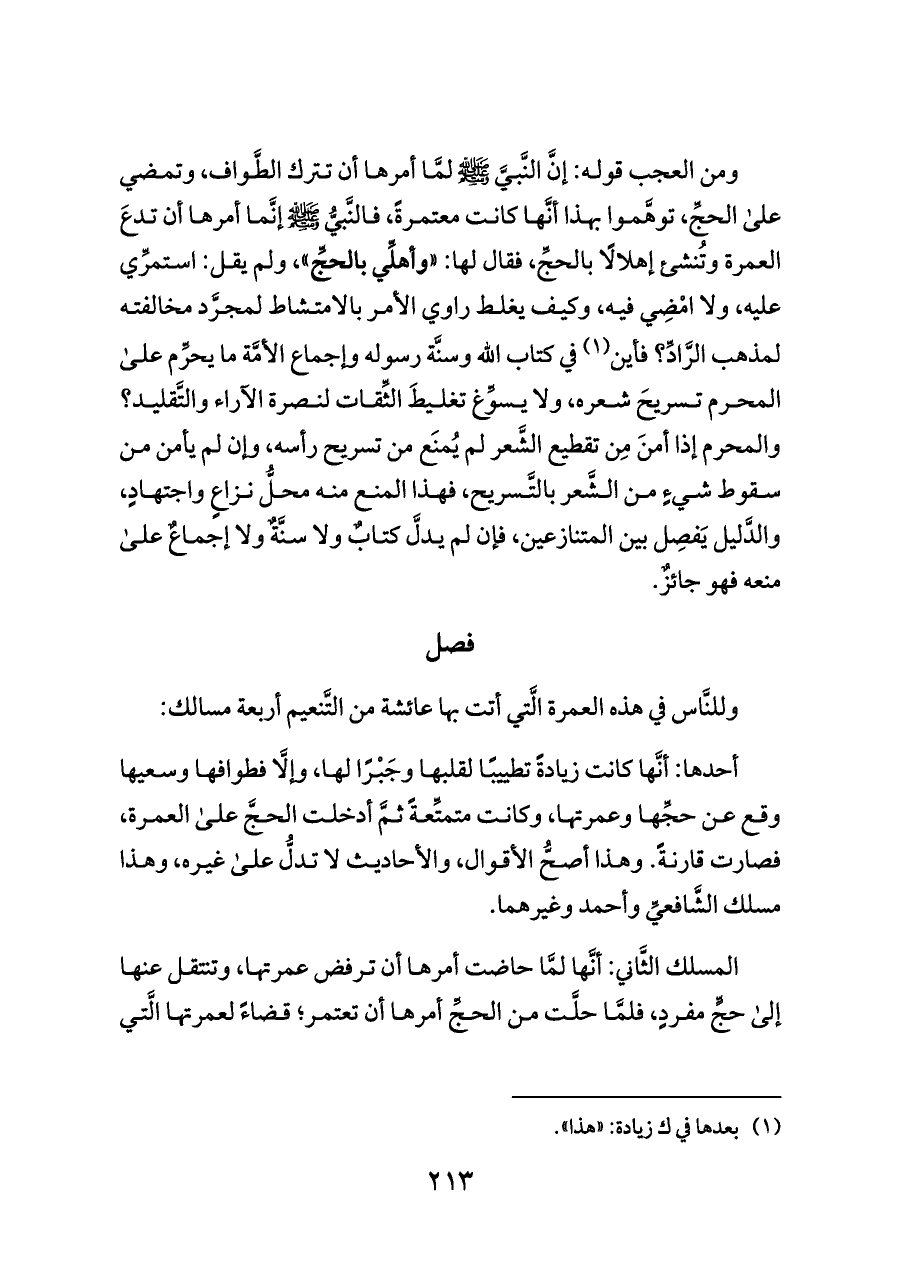 ومن العجب قوله: إنَّ النَّبيَّ - صلى الله عليه وسلم - لمَّا أمرها أن تترك الطَّواف، وتمضي على الحجِّ، توهَّموا بهذا أنَّها كانت معتمرةً، فالنَّبيُّ - صلى الله عليه وسلم - إنَّما أمرها أن تدعَ العمرة وتُنشئ إهلالًا بالحجِّ، فقال لها: «وأهلِّي بالحجِّ»، ولم يقل: استمرِّي عليه، ولا امْضِي فيه، وكيف يغلط راوي الأمر بالامتشاط لمجرَّد مخالفته لمذهب الرَّادِّ؟ فأين (¬١) في كتاب الله وسنَّة رسوله وإجماع الأمَّة ما يحرِّم على المحرم تسريحَ شعره، ولا يسوِّغ تغليطَ الثِّقات لنصرة الآراء والتَّقليد؟ والمحرم إذا أمنَ مِن تقطيع الشَّعر لم يُمنَع من تسريح رأسه، وإن لم يأمن من سقوط شيءٍ من الشَّعر بالتَّسريح، فهذا المنع منه محلُّ نزاعٍ واجتهادٍ، والدَّليل يَفصِل بين المتنازعين، فإن لم يدلَّ كتابٌ ولا سنَّةٌ ولا إجماعٌ على منعه فهو جائزٌ.