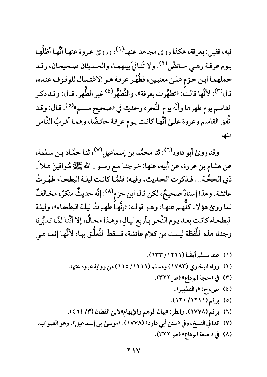 وقد روى أبو داود (¬٦): ثنا محمَّد بن إسماعيل (¬٧)، ثنا حمَّاد بن سلمة، عن هشام بن عروة، عن أبيه، عنها: خرجنا مع رسول الله - صلى الله عليه وسلم - مُوافينَ هلالَ ذي الحجَّة ... فذكرت الحديث، وفيه: فلمَّا كانت ليلة البطحاء طهُرتْ عائشة. وهذا إسنادٌ صحيحٌ، لكن قال ابن حزمٍ (¬٨): إنَّه حديثٌ منكرٌ، مخالفٌ لما روى هؤلاء كلُّهم عنها، وهو قوله: «إنَّها طهرتْ ليلة البطحاء»، وليلة البطحاء كانت بعد يوم النَّحر بأربع ليالٍ، وهذا محالٌ، إلا أنَّنا لمَّا تدبَّرنا وجدنا هذه اللَّفظة ليست من كلام عائشة، فسقطَ التَّعلُّق بها، لأنَّها إنما هي