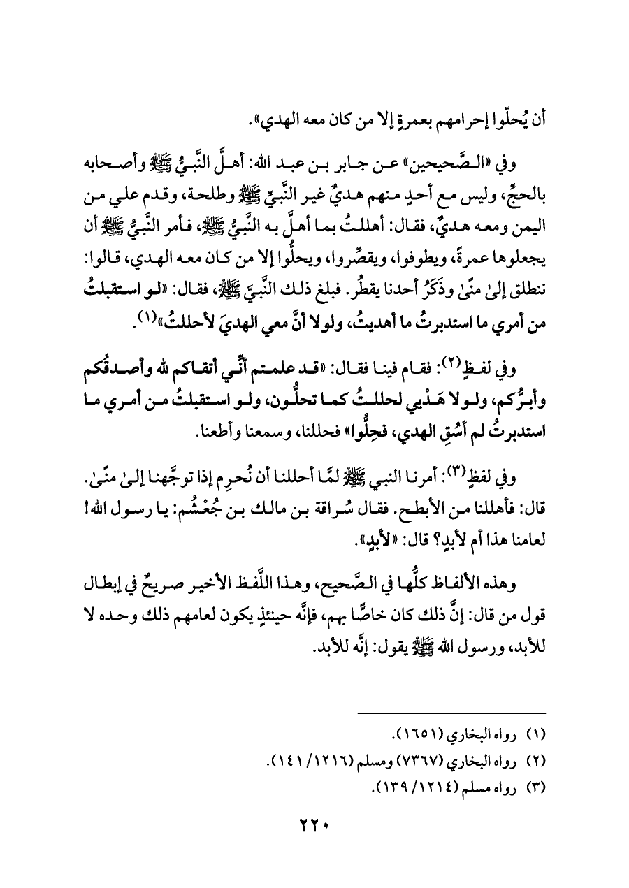 وفي «الصَّحيحين» عن جابر بن عبد اللَّه: أهلَّ النَّبيُّ - صلى الله عليه وسلم - وأصحابه بالحجِّ، وليس مع أحدٍ منهم هديٌ غير النَّبيِّ - صلى الله عليه وسلم - وطلحة، وقدم علي من اليمن ومعه هديٌ، فقال: أهللتُ بما أهلَّ به النَّبيُّ - صلى الله عليه وسلم -، فأمر النَّبيُّ - صلى الله عليه وسلم - أن يجعلوها عمرةً، ويطوفوا، ويقصِّروا، ويحلُّوا إلا من كان معه الهدي، قالوا: ننطلق إلى منًى وذَكَرُ أحدنا يقطُر. فبلغ ذلك النَّبيَّ - صلى الله عليه وسلم -، فقال: «لو استقبلتُ من أمري ما استدبرتُ ما أهديتُ، ولولا أنَّ معي الهديَ لأحللتُ» (¬١).