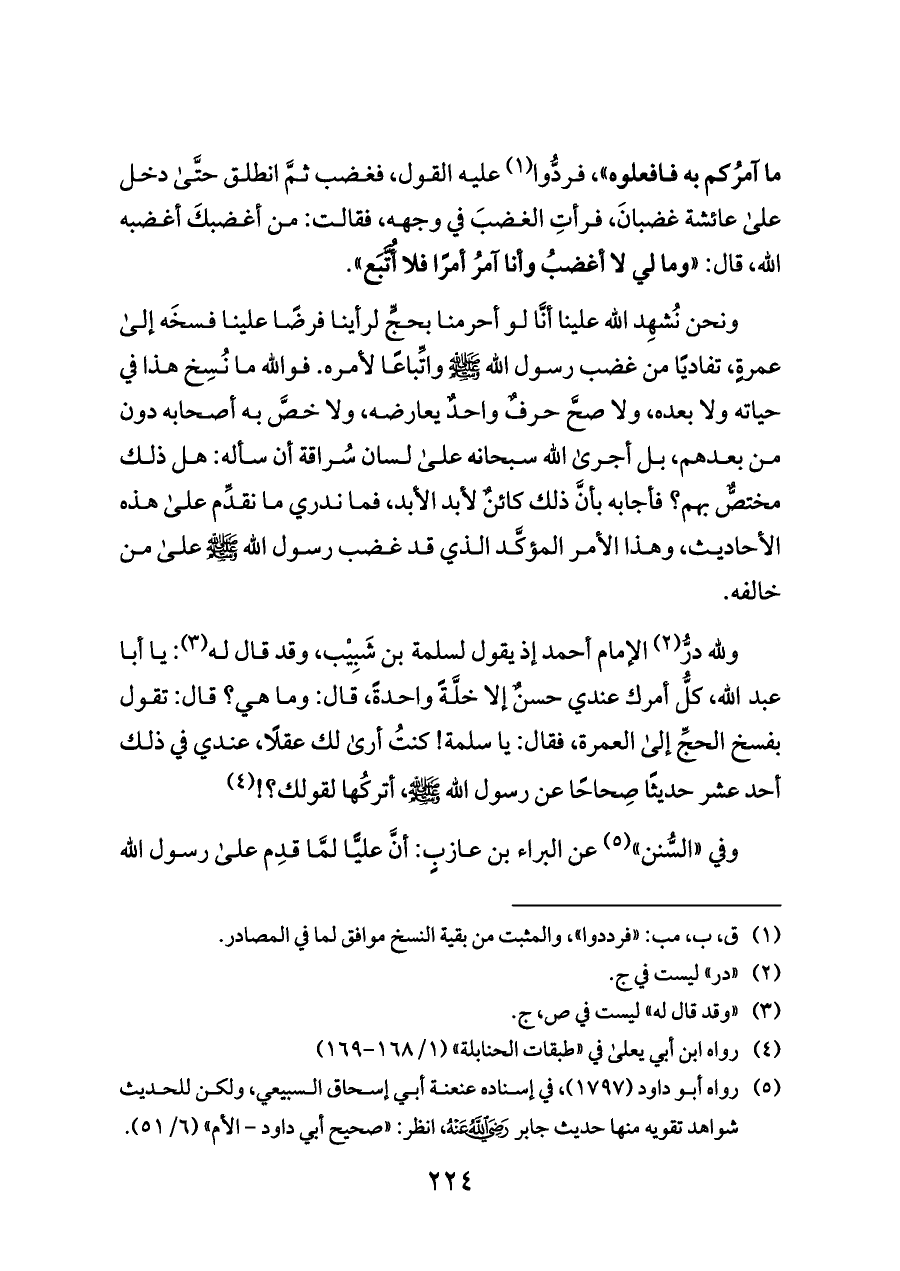 ونحن نُشهِد الله علينا أنَّا لو أحرمنا بحجٍّ لرأينا فرضًا علينا فسخَه إلى عمرةٍ، تفاديًا من غضب رسول الله - صلى الله عليه وسلم - واتِّباعًا لأمره. فواللَّه ما نُسِخ هذا في حياته ولا بعده، ولا صحَّ حرفٌ واحدٌ يعارضه، ولا خصَّ به أصحابه دون من بعدهم، بل أجرى الله سبحانه على لسان سُراقة أن سأله: هل ذلك مختصٌّ بهم؟ فأجابه بأنَّ ذلك كائنٌ لأبد الأبد، فما ندري ما نقدِّم على هذه الأحاديث، وهذا الأمر المؤكَّد الذي قد غضب رسول الله - صلى الله عليه وسلم - على من خالفه.