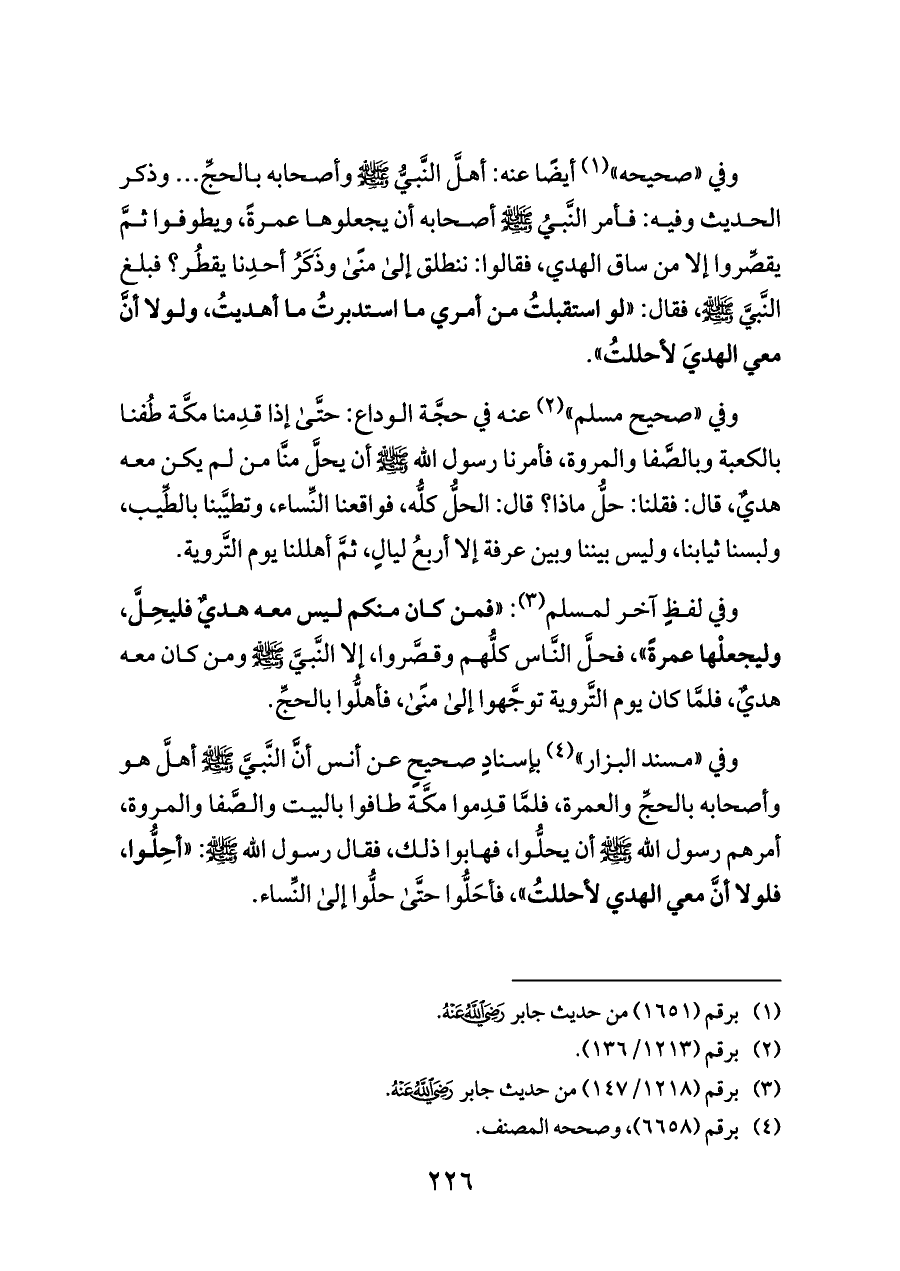 وفي «صحيحه» (¬١) أيضًا عنه: أهلَّ النَّبيُّ - صلى الله عليه وسلم - وأصحابه بالحجِّ ... وذكر الحديث وفيه: فأمر النَّبيُ - صلى الله عليه وسلم - أصحابه أن يجعلوها عمرةً، ويطوفوا ثمَّ يقصِّروا إلا من ساق الهدي، فقالوا: ننطلق إلى منًى وذَكَرُ أحدِنا يقطُر؟ فبلغ النَّبيَّ - صلى الله عليه وسلم -، فقال: «لو استقبلتُ من أمري ما استدبرتُ ما أهديتُ، ولولا أنَّ معي الهديَ لأحللتُ».