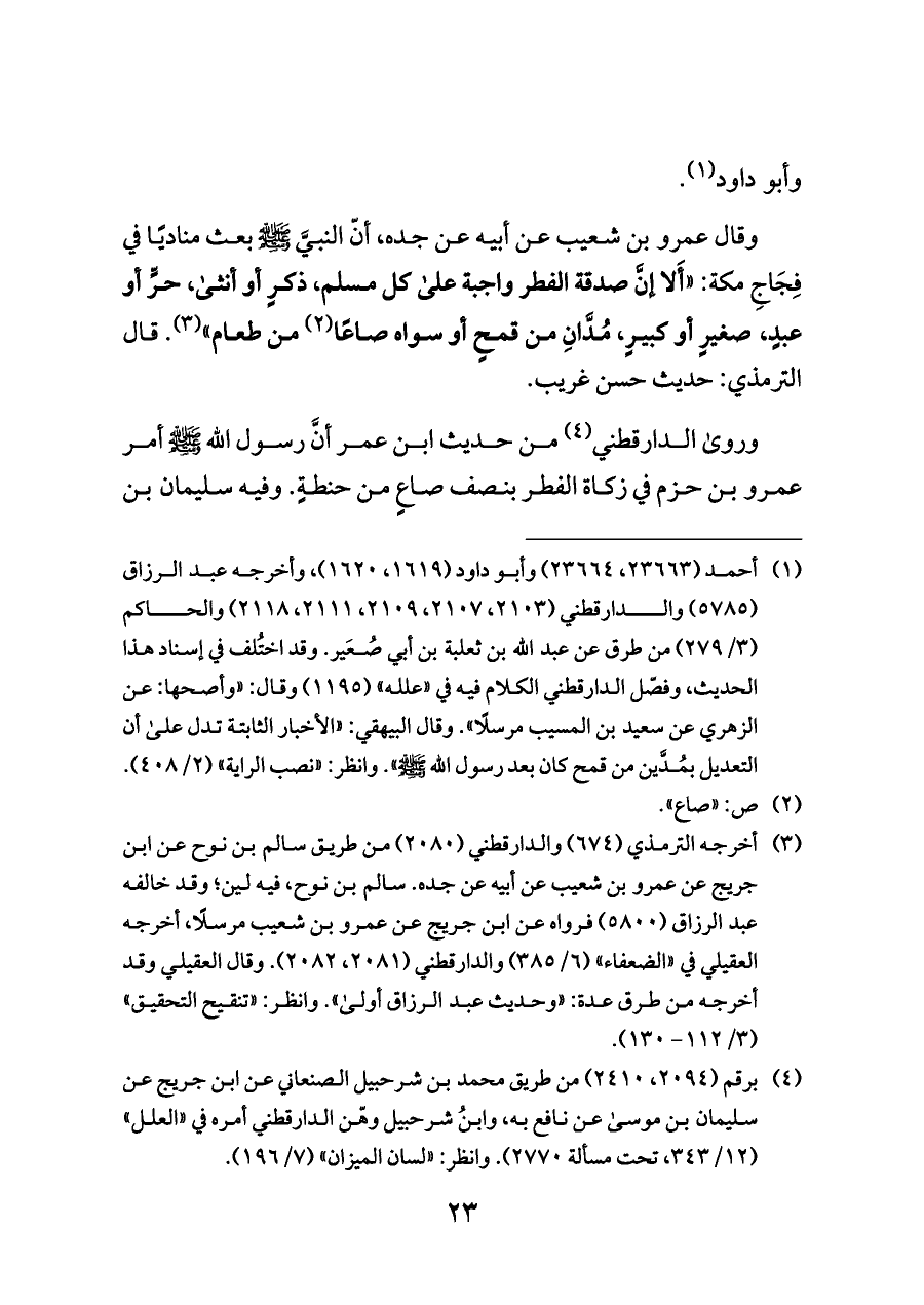(¬٣) أخرجه الترمذي (٦٧٤) والدارقطني (٢٠٨٠) من طريق سالم بن نوح عن ابن جريج عن عمرو بن شعيب عن أبيه عن جده. سالم بن نوح، فيه لين؛ وقد خالفه عبد الرزاق (٥٨٠٠) فرواه عن ابن جريج عن عمرو بن شعيب مرسلًا، أخرجه العقيلي في «الضعفاء» (٦/ ٣٨٥) والدارقطني (٢٠٨١، ٢٠٨٢). وقال العقيلي وقد أخرجه من طرق عدة: «وحديث عبد الرزاق أولى». وانظر: «تنقيح التحقيق» (٣/ ١١٢ - ١٣٠).
