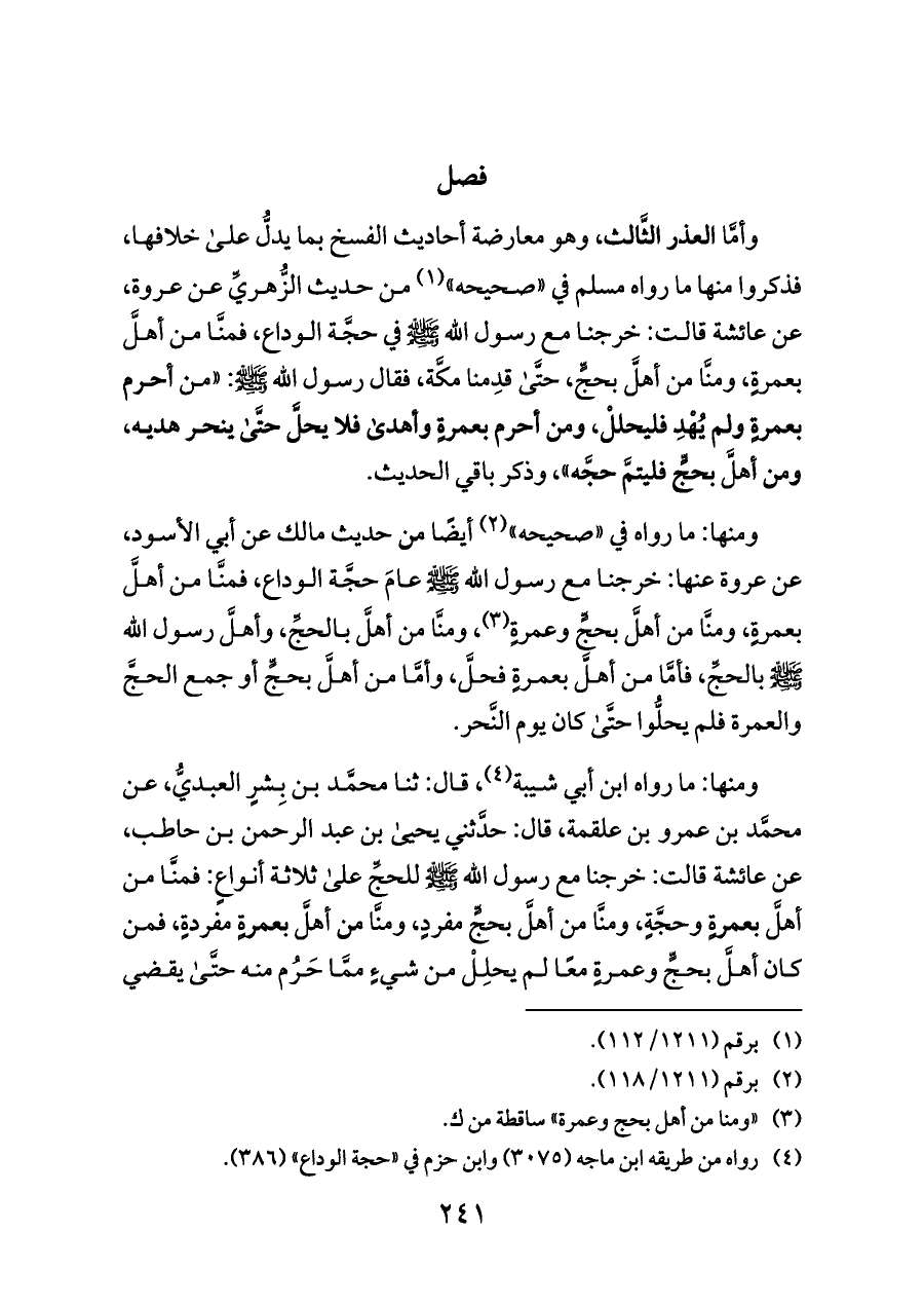 ومنها: ما رواه ابن أبي شيبة (¬٤)، قال: ثنا محمَّد بن بِشرٍ العبديُّ، عن محمَّد بن عمرو بن علقمة، قال: حدَّثني يحيى بن عبد الرحمن بن حاطب، عن عائشة قالت: خرجنا مع رسول الله - صلى الله عليه وسلم - للحجِّ على ثلاثة أنواعٍ: فمنَّا من أهلَّ بعمرةٍ وحجَّةٍ، ومنَّا من أهلَّ بحجٍّ مفردٍ، ومنَّا من أهلَّ بعمرةٍ مفردةٍ، فمن كان أهلَّ بحجٍّ وعمرةٍ معًا لم يحلِلْ من شيءٍ ممَّا حَرُم منه حتَّى يقضي
