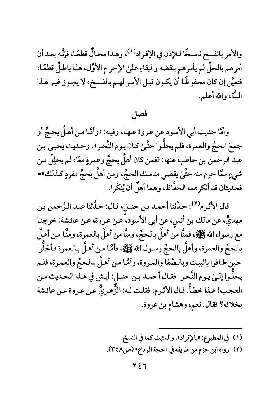 والأمر بالفسخ ناسخًا للإذن في الإفراد (¬١)، وهذا محالٌ قطعًا، فإنَّه بعد أن أمرهم بالحلِّ لم يأمرهم بنقضه والبقاءِ على الإحرام الأوَّل، هذا باطلٌ قطعًا، فتعيَّن إن كان محفوظًا أن يكون قبل الأمر لهم بالفسخ، لا يجوز غير هذا البتَّة، والله أعلم.