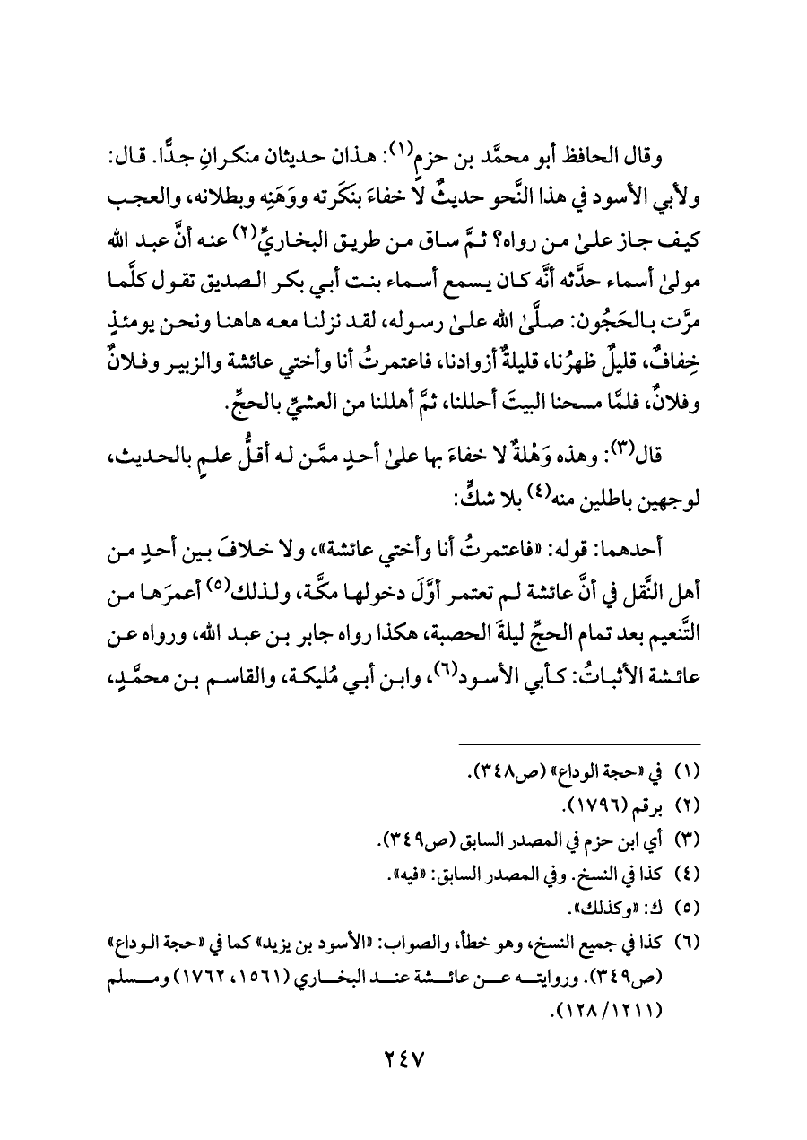 وقال الحافظ أبو محمَّد بن حزمٍ (¬١): هذان حديثان منكرانِ جدًّا. قال: ولأبي الأسود في هذا النَّحو حديثٌ لا خفاءَ بنَكَرته ووَهَنِه وبطلانه، والعجب كيف جاز على من رواه؟ ثمَّ ساق من طريق البخاريِّ (¬٢) عنه أنَّ عبد الله مولى أسماء حدَّثه أنَّه كان يسمع أسماء بنت أبي بكر الصديق تقول كلَّما مرَّت بالحَجُون: صلَّى الله على رسوله، لقد نزلنا معه هاهنا ونحن يومئذٍ خِفافٌ، قليلٌ ظهرُنا، قليلةٌ أزوادنا، فاعتمرتُ أنا وأختي عائشة والزبير وفلانٌ وفلانٌ، فلمَّا مسحنا البيتَ أحللنا، ثمَّ أهللنا من العشيِّ بالحجِّ.
