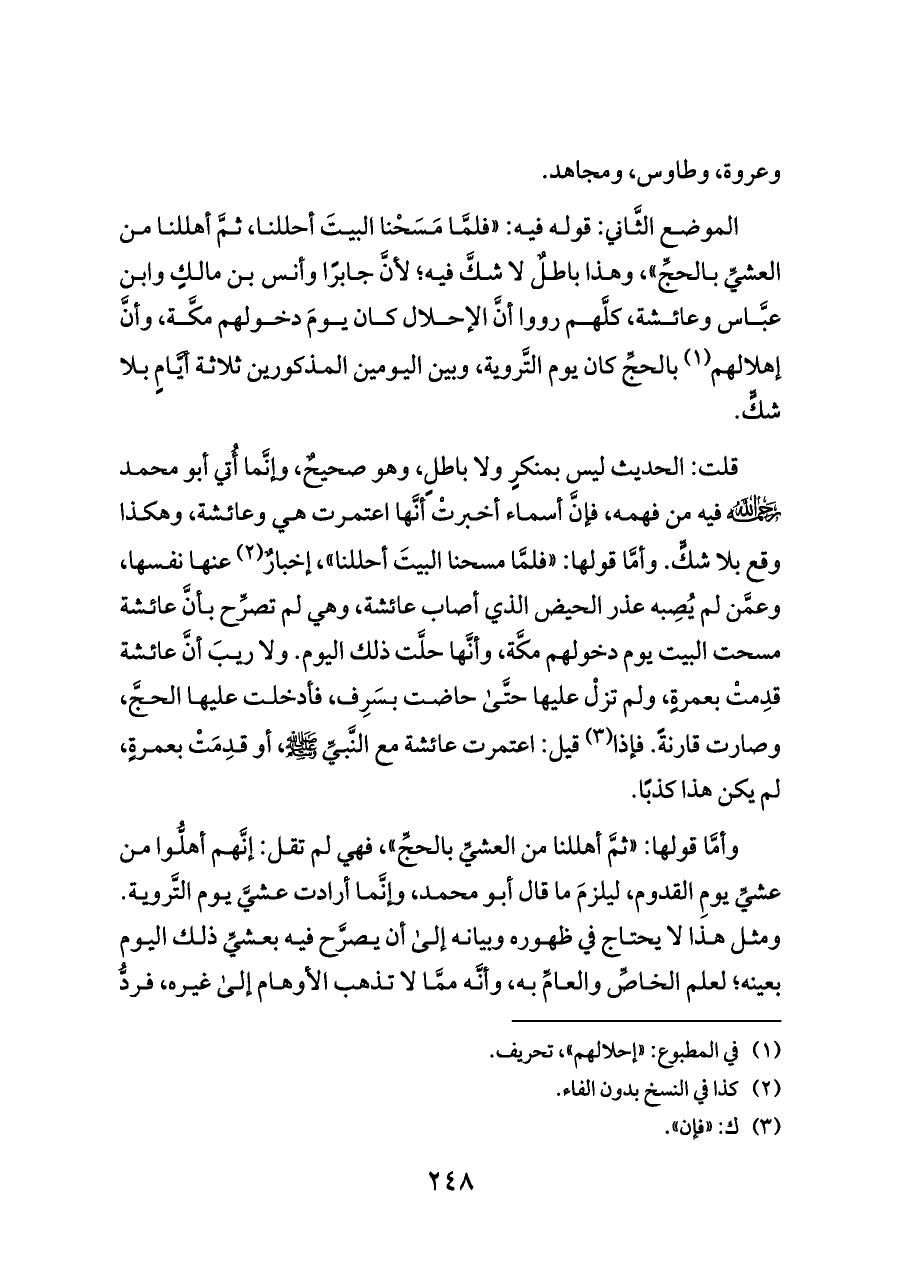 الموضع الثَّاني: قوله فيه: «فلمَّا مَسَحْنا البيتَ أحللنا، ثمَّ أهللنا من العشيِّ بالحجِّ»، وهذا باطلٌ لا شكَّ فيه؛ لأنَّ جابرًا وأنس بن مالكٍ وابن عبَّاس وعائشة، كلَّهم رووا أنَّ الإحلال كان يومَ دخولهم مكَّة، وأنَّ إهلالهم (¬١) بالحجِّ كان يوم التَّروية، وبين اليومين المذكورين ثلاثة أيَّامٍ بلا شكٍّ.