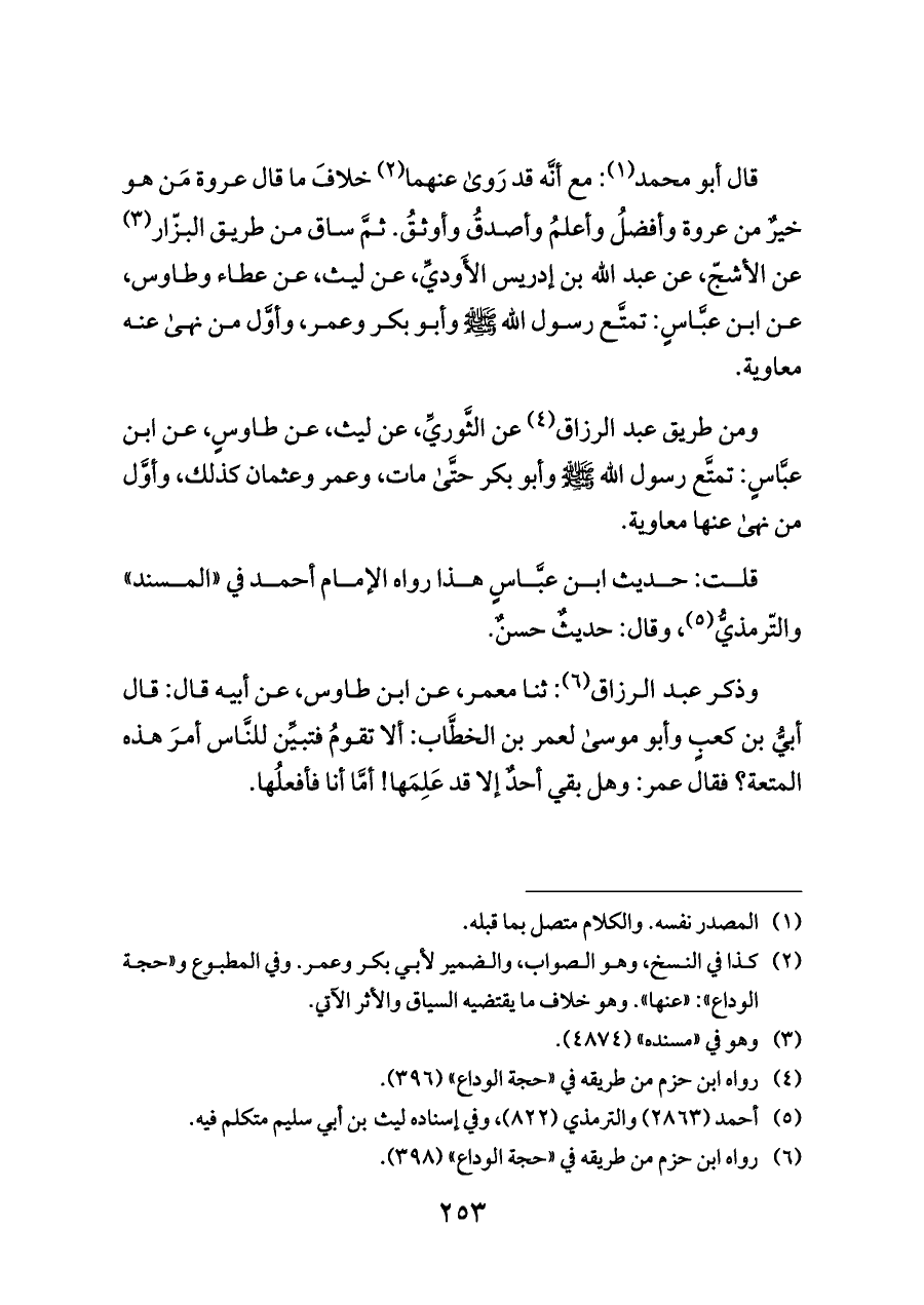 قال أبو محمد (¬١): مع أنَّه قد رَوى عنهما (¬٢) خلافَ ما قال عروة مَن هو خيرٌ من عروة وأفضلُ وأعلمُ وأصدقُ وأوثقُ. ثمَّ ساق من طريق البزّار (¬٣) عن الأشجّ، عن عبد الله بن إدريس الأَوديِّ، عن ليث، عن عطاء وطاوس، عن ابن عبَّاسٍ: تمتَّع رسول الله - صلى الله عليه وسلم - وأبو بكر وعمر، وأوَّل من نهى عنه معاوية.
