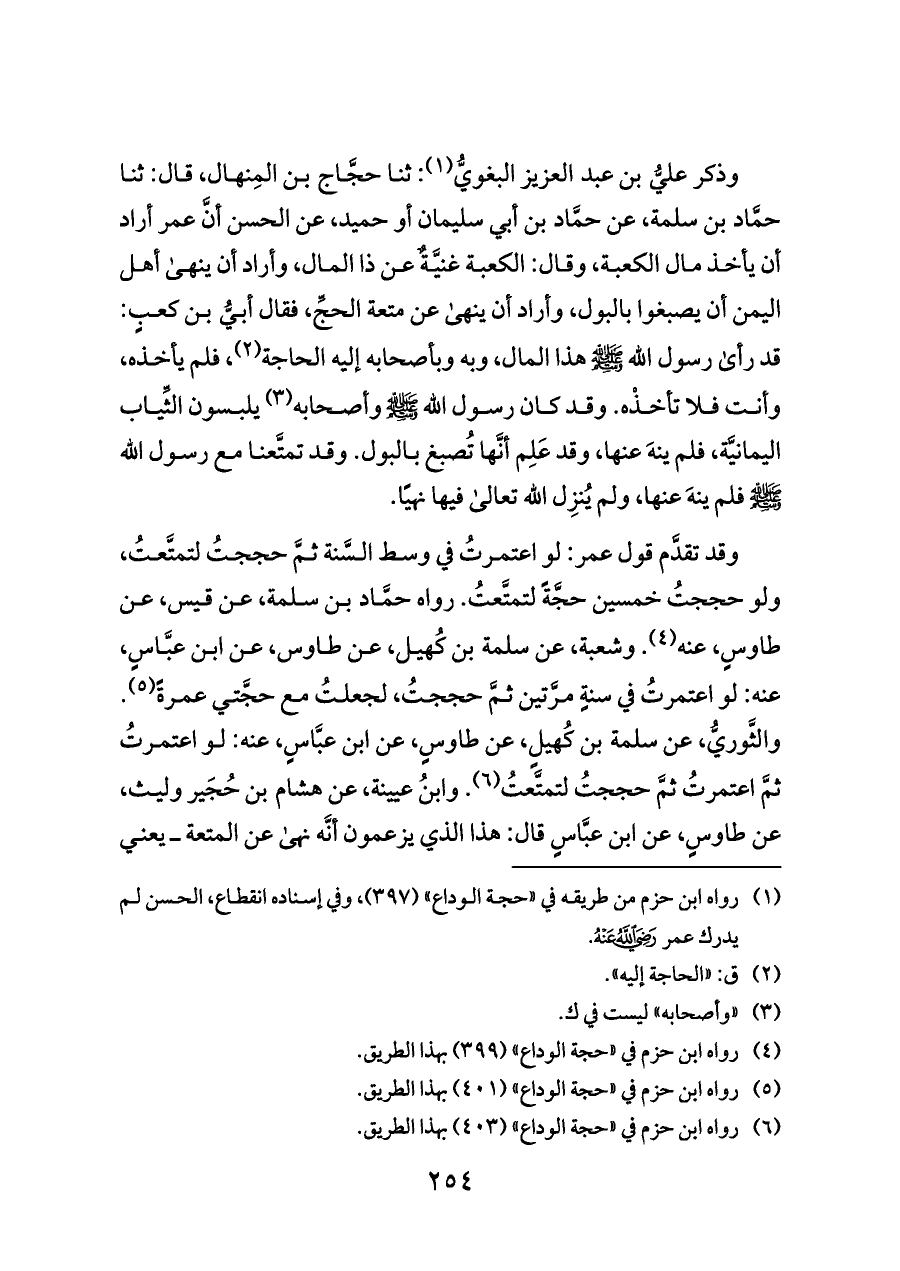 وذكر عليُّ بن عبد العزيز البغويُّ (¬١): ثنا حجَّاج بن المِنهال، قال: ثنا حمَّاد بن سلمة، عن حمَّاد بن أبي سليمان أو حميد، عن الحسن أنَّ عمر أراد أن يأخذ مال الكعبة، وقال: الكعبة غنيَّةٌ عن ذا المال، وأراد أن ينهى أهل اليمن أن يصبغوا بالبول، وأراد أن ينهى عن متعة الحجِّ، فقال أبيُّ بن كعبٍ: قد رأى رسول الله - صلى الله عليه وسلم - هذا المال، وبه وبأصحابه إليه الحاجة (¬٢)، فلم يأخذه، وأنت فلا تأخذْه. وقد كان رسول الله - صلى الله عليه وسلم - وأصحابه (¬٣) يلبسون الثِّياب اليمانيَّة، فلم ينهَ عنها، وقد عَلِم أنَّها تُصبغ بالبول. وقد تمتَّعنا مع رسول الله - صلى الله عليه وسلم - فلم ينهَ عنها، ولم يُنزِل الله تعالى فيها نهيًا.