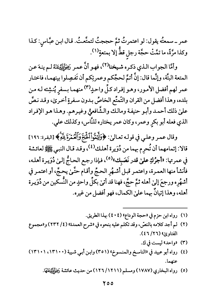 وأمَّا الجواب الذي ذكره شيخنا (¬٢)، فهو أنَّ عمر - رضي الله عنه - لم ينهَ عن المتعة البتَّة، وإنَّما قال: إنَّ أتمَّ لحجِّكم وعمرتِكم أن تَفصِلوا بينهما، فاختار عمر لهم أفضل الأمور، وهو إفراد كلِّ واحدٍ (¬٣) منهما بسفرٍ يُنشِئه له من بلده، وهذا أفضل من القران والتّمتِّع الخاصِّ بدون سفرةٍ أخرى، وقد نصَّ على ذلك أحمد وأبو حنيفة ومالك والشَّافعيُّ وغيرهم. وهذا هو الإفراد الذي فعله أبو بكرٍ وعمر، وكان عمر يختاره للنَّاس، وكذلك علي.