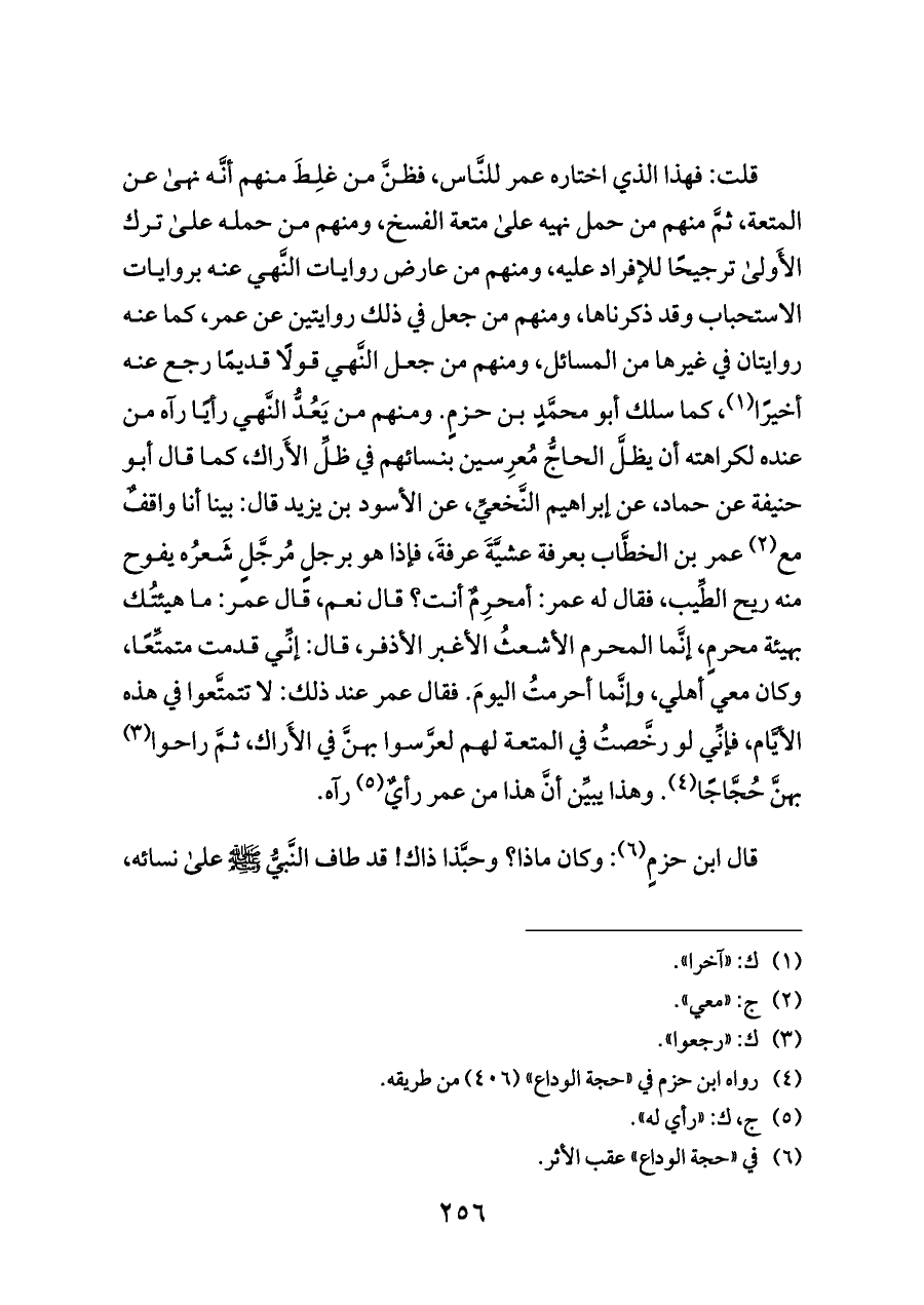 قلت: فهذا الذي اختاره عمر للنَّاس، فظنَّ من غلِطَ منهم أنَّه نهى عن المتعة، ثمَّ منهم من حمل نهيه على متعة الفسخ، ومنهم من حمله على ترك الأَولى ترجيحًا للإفراد عليه، ومنهم من عارض روايات النَّهي عنه بروايات الاستحباب وقد ذكرناها، ومنهم من جعل في ذلك روايتين عن عمر، كما عنه روايتان في غيرها من المسائل، ومنهم من جعل النَّهي قولًا قديمًا رجع عنه أخيرًا (¬١)، كما سلك أبو محمَّدٍ بن حزمٍ. ومنهم من يَعُدُّ النَّهي رأيًا رآه من عنده لكراهته أن يظلَّ الحاجُّ مُعرِسين بنسائهم في ظلِّ الأَراك، كما قال أبو حنيفة عن حماد، عن إبراهيم النَّخعيِّ، عن الأسود بن يزيد قال: بينا أنا واقفٌ مع (¬٢) عمر بن الخطَّاب بعرفة عشيَّةَ عرفةَ، فإذا هو برجلٍ مُرجَّلٍ شَعرُه يفوح منه ريح الطِّيب، فقال له عمر: أمحرِمٌ أنت؟ قال نعم، قال عمر: ما هيئتُك بهيئة محرمٍ، إنَّما المحرم الأشعثُ الأغبر الأذفر، قال: إنِّي قدمت متمتِّعًا، وكان معي أهلي، وإنَّما أحرمتُ اليومَ. فقال عمر عند ذلك: لا تتمتَّعوا في هذه الأيَّام، فإنِّي لو رخَّصتُ في المتعة لهم لعرَّسوا بهنَّ في الأَراك، ثمَّ راحوا (¬٣) بهنَّ حُجَّاجًا (¬٤). وهذا يبيِّن أنَّ هذا من عمر رأيٌ (¬٥) رآه.