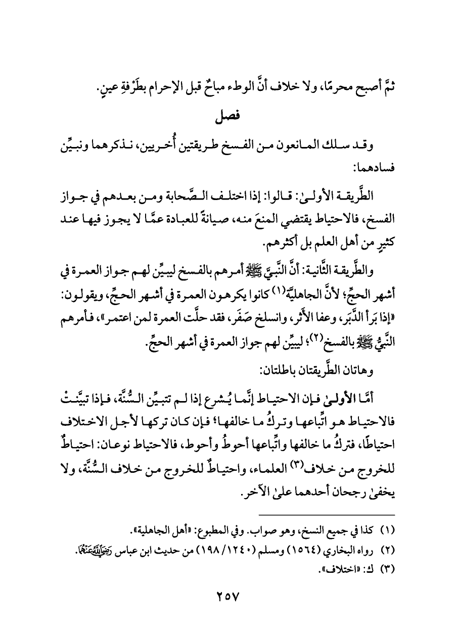 الطَّريقة الأولى: قالوا: إذا اختلف الصَّحابة ومن بعدهم في جواز الفسخ، فالاحتياط يقتضي المنعَ منه، صيانةً للعبادة عمَّا لا يجوز فيها عند كثيرٍ من أهل العلم بل أكثرهم.