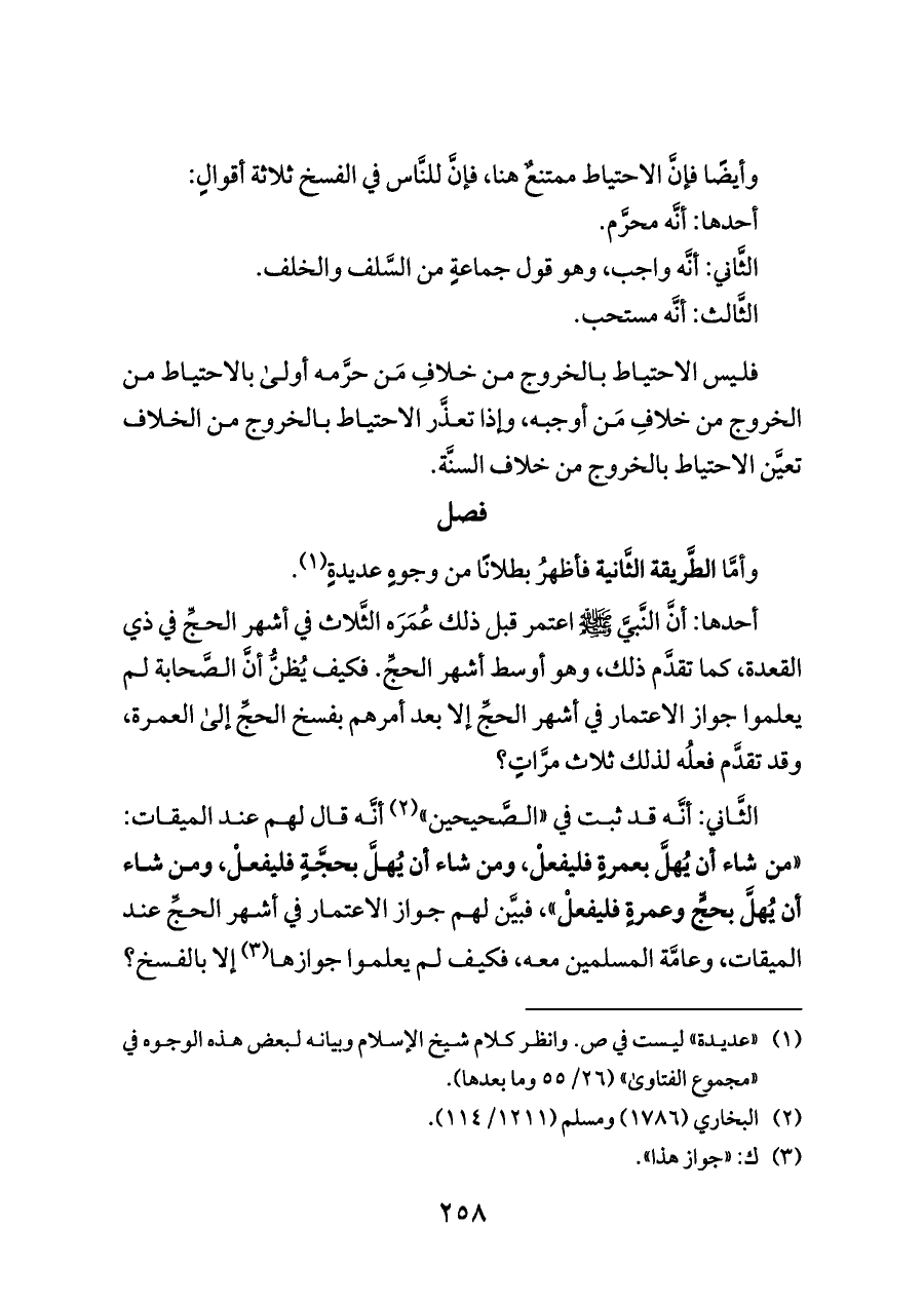 أحدها: أنَّ النَّبيَّ - صلى الله عليه وسلم - اعتمر قبل ذلك عُمَرَه الثَّلاث في أشهر الحجِّ في ذي القعدة، كما تقدَّم ذلك، وهو أوسط أشهر الحجِّ. فكيف يُظنُّ أنَّ الصَّحابة لم يعلموا جواز الاعتمار في أشهر الحجِّ إلا بعد أمرهم بفسخ الحجِّ إلى العمرة، وقد تقدَّم فعلُه لذلك ثلاث مرَّاتٍ؟