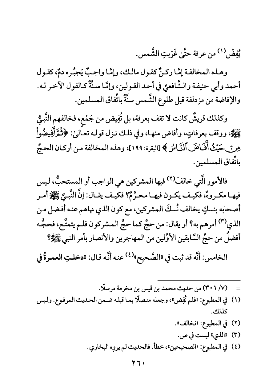 وكذلك قريشٌ كانت لا تقف بعرفة، بل تُفِيض من جَمْعٍ، فخالفهم النَّبيُّ - صلى الله عليه وسلم -، ووقف بعرفاتٍ، وأفاض منها، وفي ذلك نزل قوله تعالى: {ثُمَّ أَفِيضُوا مِنْ حَيْثُ أَفَاضَ النَّاسُ} [البقرة: ١٩٩]، وهذه المخالفة من أركان الحجِّ باتِّفاق المسلمين.