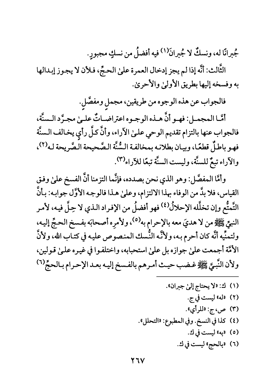 وأمَّا المفصَّل: وهو الذي نحن بصدده، فإنَّما التزمنا أنَّ الفسخ على وفق القياس، فلا بدَّ من الوفاء بهذا الالتزام، وعلى هذا فالوجه الأوَّل جوابه: بأنَّ التَّمتُّع وإن تخلَّله الإحلالُ (¬٤) فهو أفضلُ من الإفراد الذي لا حِلَّ فيه، لأمر النبيِّ - صلى الله عليه وسلم - من لا هديَ معه بالإحرام به (¬٥)، ولأمرِه أصحابَه بفسخ الحجِّ إليه، ولتمنِّيه أنَّه كان أحرم به، ولأنَّه النُّسك المنصوص عليه في كتاب اللَّه، ولأنَّ الأمَّة أجمعت على جوازه بل على استحبابه، واختلفوا في غيره على قولين، ولأن النَّبيَّ - صلى الله عليه وسلم - غضب حيث أمرهم بالفسخ إليه بعد الإحرام بالحجِّ (¬٦)