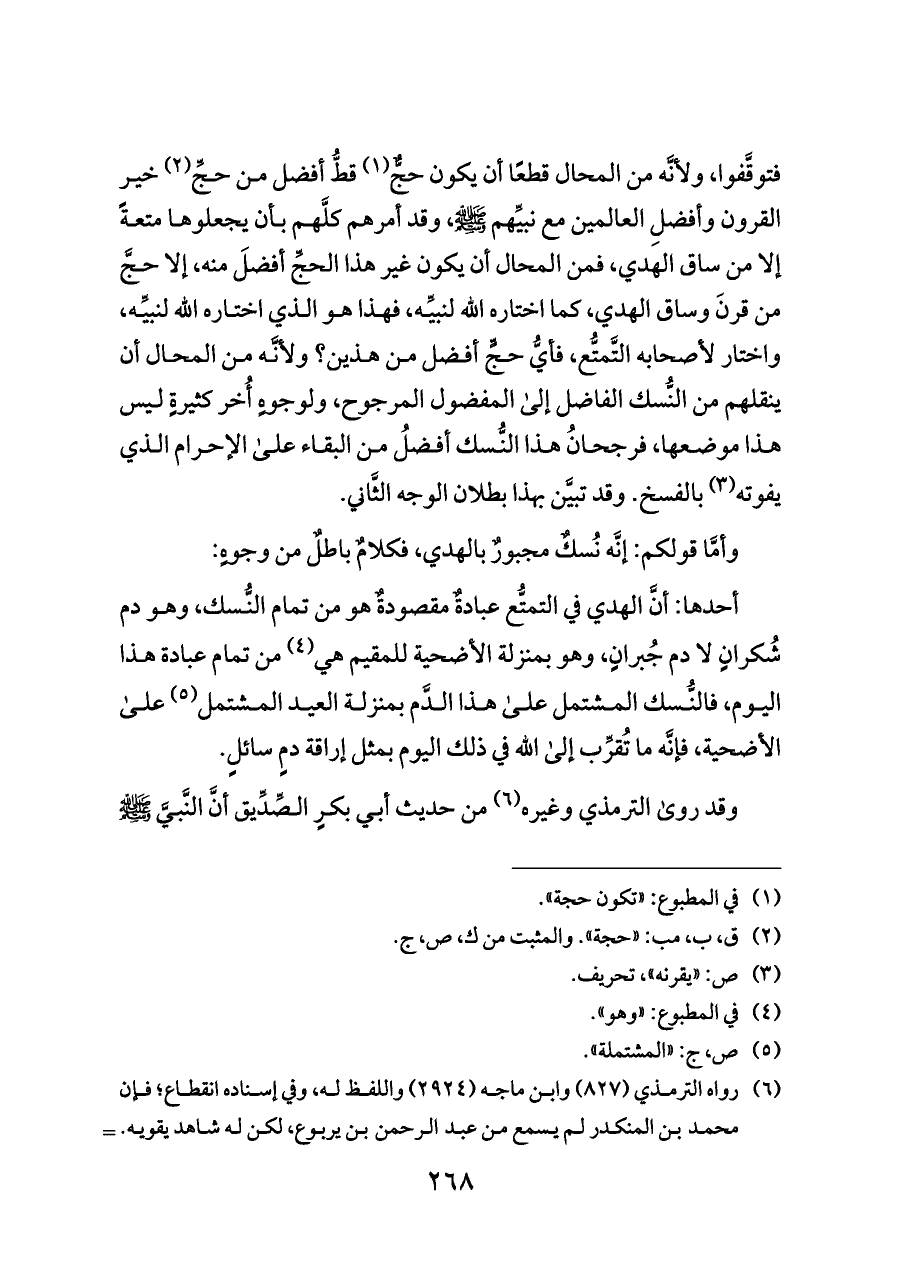 فتوقَّفوا، ولأنَّه من المحال قطعًا أن يكون حجٌّ (¬١) قطُّ أفضل من حجِّ (¬٢) خير القرون وأفضلِ العالمين مع نبيِّهم - صلى الله عليه وسلم -، وقد أمرهم كلَّهم بأن يجعلوها متعةً إلا من ساق الهدي، فمن المحال أن يكون غير هذا الحجِّ أفضلَ منه، إلا حجَّ من قرنَ وساق الهدي، كما اختاره الله لنبيِّه، فهذا هو الذي اختاره الله لنبيِّه، واختار لأصحابه التَّمتُّع، فأيُّ حجٍّ أفضل من هذين؟ ولأنَّه من المحال أن ينقلهم من النُّسك الفاضل إلى المفضول المرجوح، ولوجوهٍ أُخر كثيرةٍ ليس هذا موضعها، فرجحانُ هذا النُّسك أفضلُ من البقاء على الإحرام الذي يفوته (¬٣) بالفسخ. وقد تبيَّن بهذا بطلان الوجه الثَّاني.