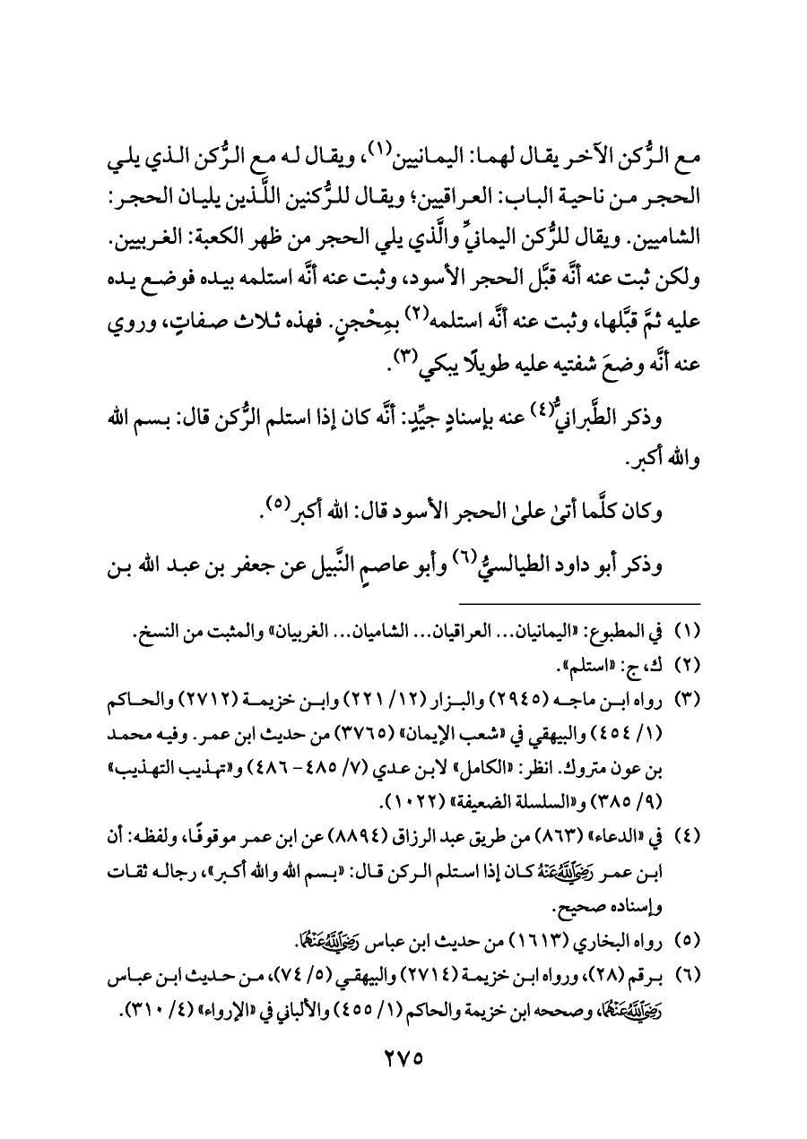 مع الرُّكن الآخر يقال لهما: اليمانيين (¬١)، ويقال له مع الرُّكن الذي يلي الحجر من ناحية الباب: العراقيين؛ ويقال للرُّكنين اللَّذين يليان الحجر: الشاميين. ويقال للرُّكن اليمانيِّ والَّذي يلي الحجر من ظهر الكعبة: الغربيين. ولكن ثبت عنه أنَّه قبَّل الحجر الأسود، وثبت عنه أنَّه استلمه بيده فوضع يده عليه ثمَّ قبَّلها، وثبت عنه أنَّه استلمه (¬٢) بمِحْجنٍ. فهذه ثلاث صفاتٍ، وروي عنه أنَّه وضعَ شفتيه عليه طويلًا يبكي (¬٣).