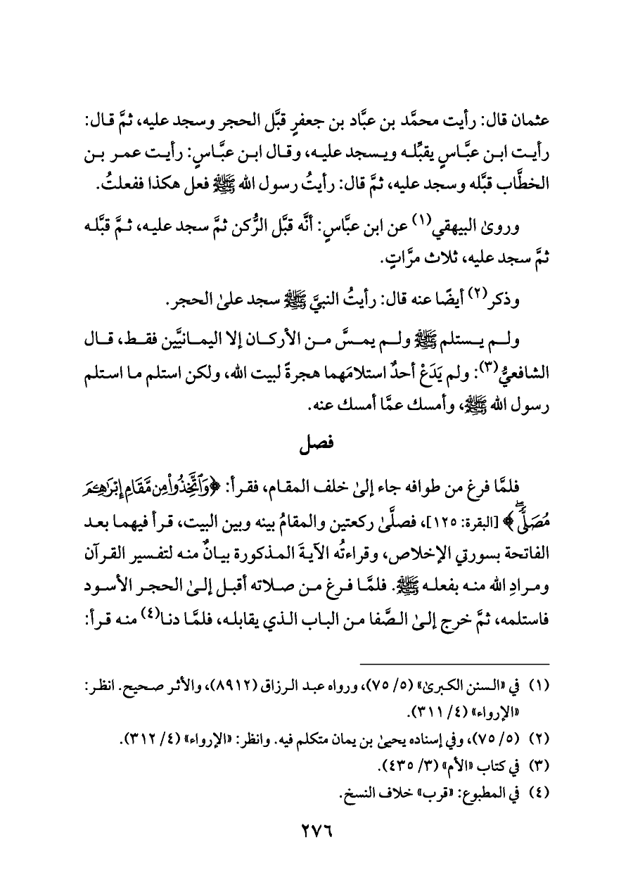 عثمان قال: رأيت محمَّد بن عبَّاد بن جعفرٍ قبَّل الحجر وسجد عليه، ثمَّ قال: رأيت ابن عبَّاسٍ يقبِّله ويسجد عليه، وقال ابن عبَّاسٍ: رأيت عمر بن الخطَّاب قبَّله وسجد عليه، ثمَّ قال: رأيتُ رسول الله - صلى الله عليه وسلم - فعل هكذا ففعلتُ.
