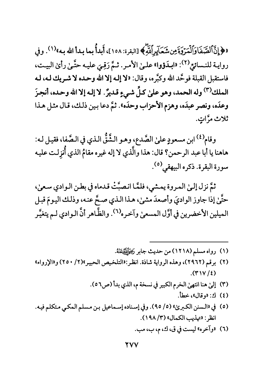 «{إِنَّ الصَّفَا وَالْمَرْوَةَ مِنْ شَعَائِرِ اللَّهِ} [البقرة: ١٥٨]، أَبدأُ بما بدأ الله به» (¬١). وفي رواية للنسائيِّ (¬٢): «ابدَؤوا» على الأمر. ثمَّ رَقِيَ عليه حتَّى رأى البيت، فاستقبل القبلة فوحَّد الله وكبَّره، وقال: «لا إله إلا الله وحده لا شريك له، له الملك (¬٣) وله الحمد، وهو على كلِّ شيءٍ قديرٌ. لا إله إلا الله وحده، أنجزَ وعدَه، ونصر عبدَه، وهزم الأحزاب وحدَه». ثمَّ دعا بين ذلك، قال مثل هذا ثلاث مرَّاتٍ.