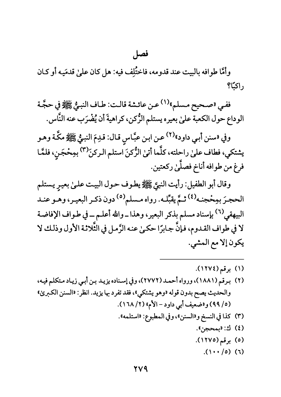 وقال أبو الطفيل: رأيت النبيَّ - صلى الله عليه وسلم - يطوف حول البيت على بعيرٍ يستلم الحجرَ بمِحْجنه (¬٤) ثمَّ يقبِّله. رواه مسلم (¬٥) دون ذكر البعير، وهو عند البيهقي (¬٦) بإسناد مسلم بذكر البعير، وهذا ــ والله أعلم ــ في طواف الإفاضة لا في طواف القدوم، فإنَّ جابرًا حكى عنه الرَّمل في الثَّلاثة الأول وذلك لا يكون إلا مع المشي.