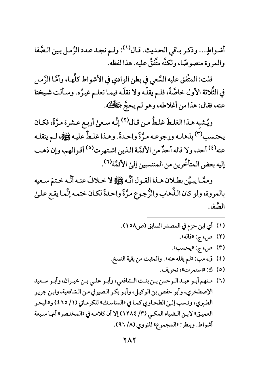 (¬٦) منهم أبو عبد الرحمن بن بنت الشافعي، وأبو علي بن خيران، وأبو سعيد الإصطخري، وأبو حفص بن الوكيل، وأبو بكر الصيرفي من الشافعية، وابن جرير الطبري، ونسب إلى الطحاوي كما في «المناسك» للكرماني (١/ ٤٦٥) و «البحر العميق» لابن الضياء المكي (٣/ ١٢٨٤) إلا أن كلامه في «المختصر» أنها سبعة أشواط. وينظر: «المجموع» للنووي (٨/ ٩٦).