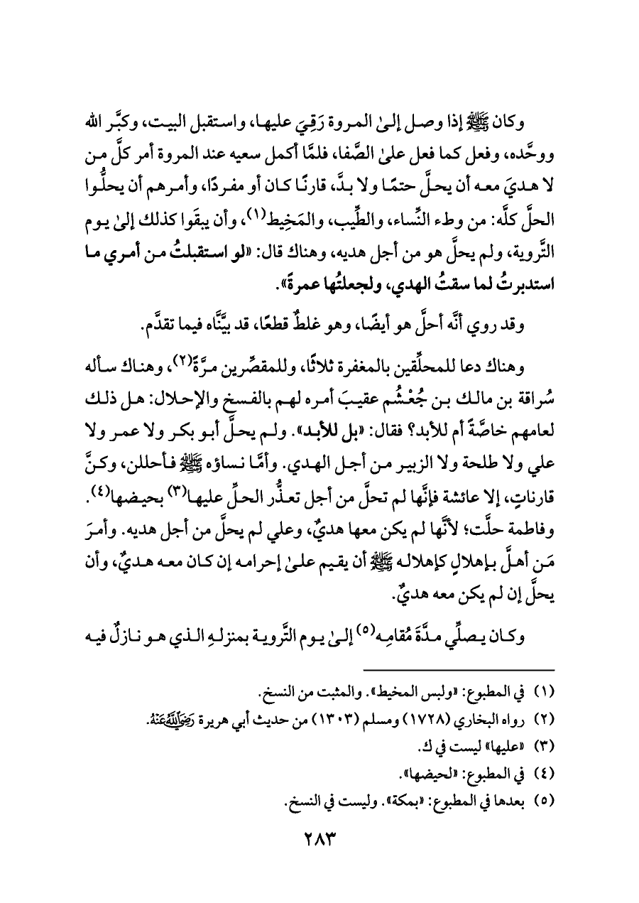 وهناك دعا للمحلِّقين بالمغفرة ثلاثًا، وللمقصِّرين مرَّةً (¬٢)، وهناك سأله سُراقة بن مالك بن جُعْشُم عقيبَ أمره لهم بالفسخ والإحلال: هل ذلك لعامهم خاصَّةً أم للأبد؟ فقال: «بل للأبد». ولم يحلَّ أبو بكر ولا عمر ولا علي ولا طلحة ولا الزبير من أجل الهدي. وأمَّا نساؤه - صلى الله عليه وسلم - فأحللن، وكنَّ قارناتٍ، إلا عائشة فإنَّها لم تحلَّ من أجل تعذُّر الحلِّ عليها (¬٣) بحيضها (¬٤). وفاطمة حلَّت؛ لأنَّها لم يكن معها هديٌ، وعلي لم يحلَّ من أجل هديه. وأمرَ مَن أهلَّ بإهلالٍ كإهلاله - صلى الله عليه وسلم - أن يقيم على إحرامه إن كان معه هديٌ، وأن يحلَّ إن لم يكن معه هديٌ.