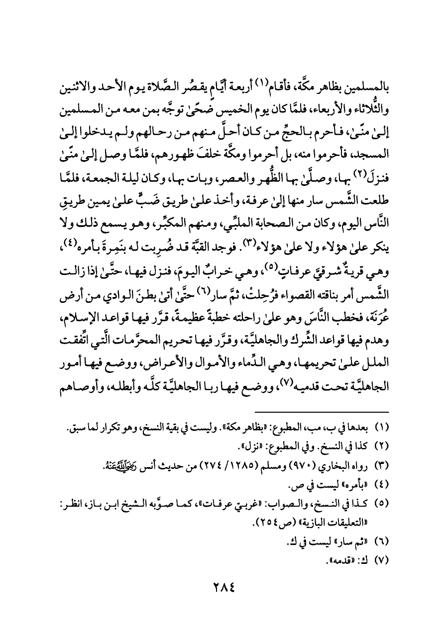 بالمسلمين بظاهر مكَّة، فأقام (¬١) أربعة أيَّامٍ يقصُر الصَّلاة يوم الأحد والاثنين والثُّلاثاء والأربعاء، فلمَّا كان يوم الخميس ضحًى توجَّه بمن معه من المسلمين إلى منًى، فأحرم بالحجِّ من كان أحلَّ منهم من رحالهم ولم يدخلوا إلى المسجد، فأحرموا منه، بل أحرموا ومكَّة خلفَ ظهورهم، فلمَّا وصل إلى منًى فنزلَ (¬٢) بها، وصلَّى بها الظُّهر والعصر، وبات بها، وكان ليلة الجمعة، فلمَّا طلعت الشَّمس سار منها إلى عرفة، وأخذ على طريق ضَبٍّ على يمين طريقِ النَّاس اليوم، وكان من الصحابة الملبِّي، ومنهم المكبِّر، وهو يسمع ذلك ولا ينكر على هؤلاء ولا على هؤلاء (¬٣). فوجد القبَّة قد ضُرِبت له بنَمِرةَ بأمره (¬٤)، وهي قريةٌ شرقيَّ عرفاتٍ (¬٥)، وهي خرابٌ اليومَ، فنزل فيها، حتَّى إذا زالت الشَّمس أمر بناقته القصواء فرُحِلتْ، ثمَّ سار (¬٦) حتَّى أتى بطنَ الوادي من أرض عُرَنَة، فخطب النَّاسَ وهو على راحلته خطبةً عظيمةً، قرَّر فيها قواعد الإسلام، وهدم فيها قواعد الشِّرك والجاهليَّة، وقرَّر فيها تحريم المحرَّمات الَّتي اتِّفقت الملل على تحريمها، وهي الدِّماء والأموال والأعراض، ووضع فيها أمور الجاهليَّة تحت قدميه (¬٧)،