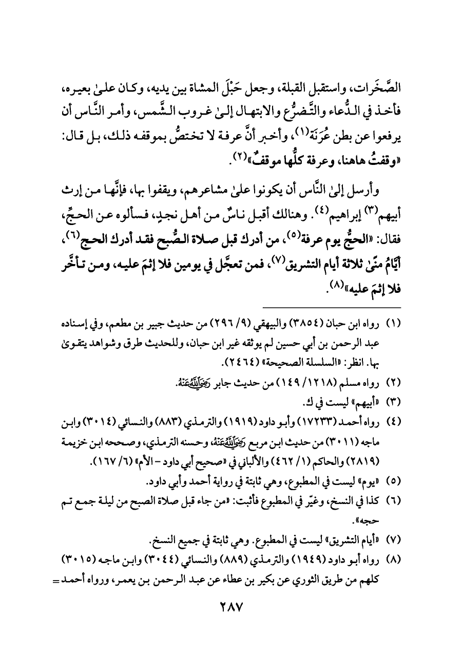 وأرسل إلى النَّاس أن يكونوا على مشاعرهم، ويقفوا بها، فإنَّها من إرث أبيهم (¬٣) إبراهيم (¬٤). وهنالك أقبل ناسٌ من أهل نجدٍ، فسألوه عن الحجِّ، فقال: «الحجُّ يوم عرفة (¬٥)، من أدرك قبل صلاة الصُّبح فقد أدرك الحج (¬٦)، أيَّامُ منًى ثلاثة أيام التشريق (¬٧)، فمن تعجَّل في يومين فلا إثمَ عليه، ومن تأخَّر فلا إثمَ عليه» (¬٨).