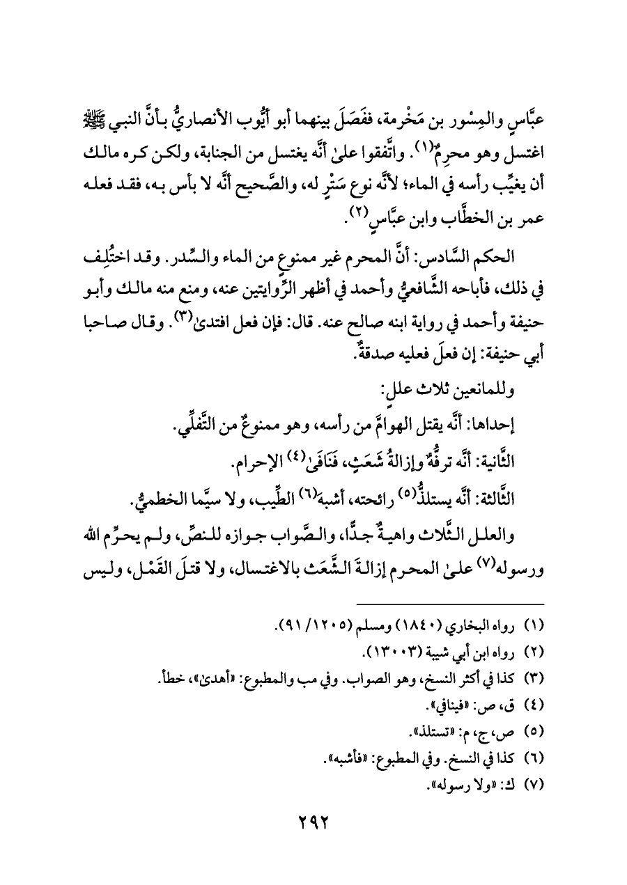 الحكم السَّادس: أنَّ المحرم غير ممنوعٍ من الماء والسِّدر. وقد اختُلِف في ذلك، فأباحه الشَّافعيُّ وأحمد في أظهر الرِّوايتين عنه، ومنع منه مالك وأبو حنيفة وأحمد في رواية ابنه صالح عنه. قال: فإن فعل افتدى (¬٣). وقال صاحبا أبي حنيفة: إن فعلَ فعليه صدقةٌ.