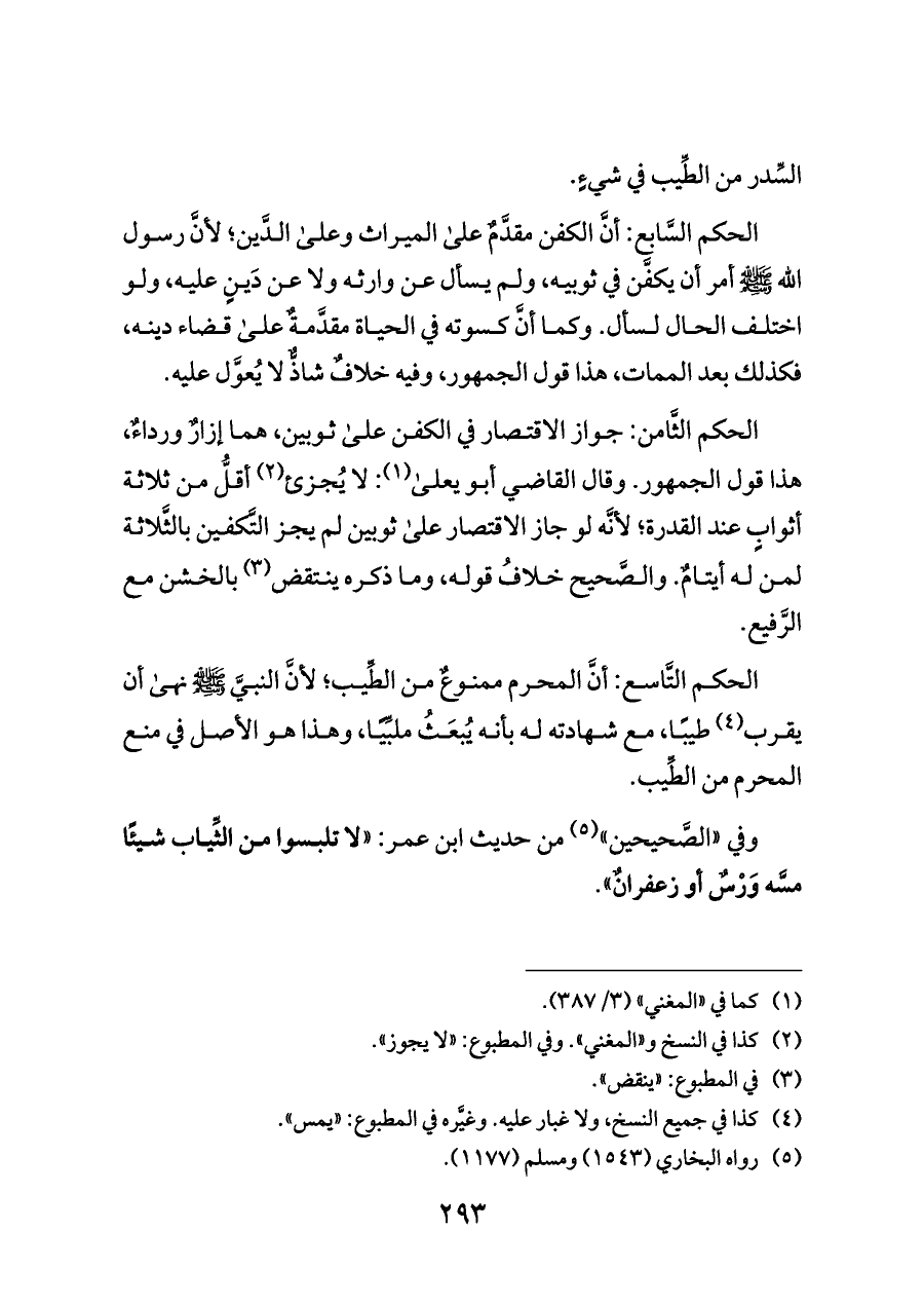 الحكم الثَّامن: جواز الاقتصار في الكفن على ثوبين، هما إزارٌ ورداءٌ، هذا قول الجمهور. وقال القاضي أبو يعلى (¬١): لا يُجزئ (¬٢) أقلُّ من ثلاثة أثوابٍ عند القدرة؛ لأنَّه لو جاز الاقتصار على ثوبين لم يجز التَّكفين بالثَّلاثة لمن له أيتامٌ. والصَّحيح خلافُ قوله، وما ذكره ينتقض (¬٣) بالخشن مع الرَّفيع.