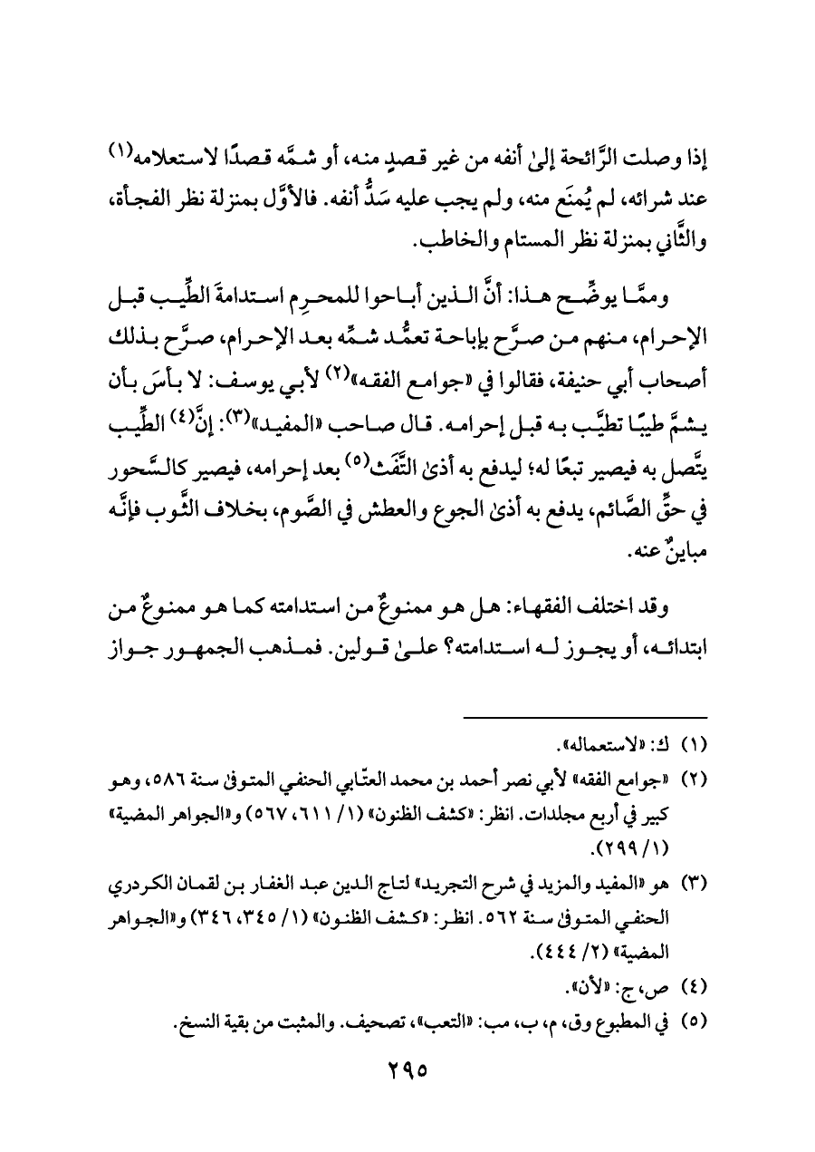 وممَّا يوضِّح هذا: أنَّ الذين أباحوا للمحرِم استدامةَ الطِّيب قبل الإحرام، منهم من صرَّح بإباحة تعمُّد شمِّه بعد الإحرام، صرَّح بذلك أصحاب أبي حنيفة، فقالوا في «جوامع الفقه» (¬٢) لأبي يوسف: لا بأسَ بأن يشمَّ طيبًا تطيَّب به قبل إحرامه. قال صاحب «المفيد» (¬٣): إنَّ (¬٤) الطِّيب يتَّصل به فيصير تبعًا له؛ ليدفع به أذى التَّفَث (¬٥) بعد إحرامه، فيصير كالسَّحور في حقِّ الصَّائم، يدفع به أذى الجوع والعطش في الصَّوم، بخلاف الثَّوب فإنَّه مباينٌ عنه.