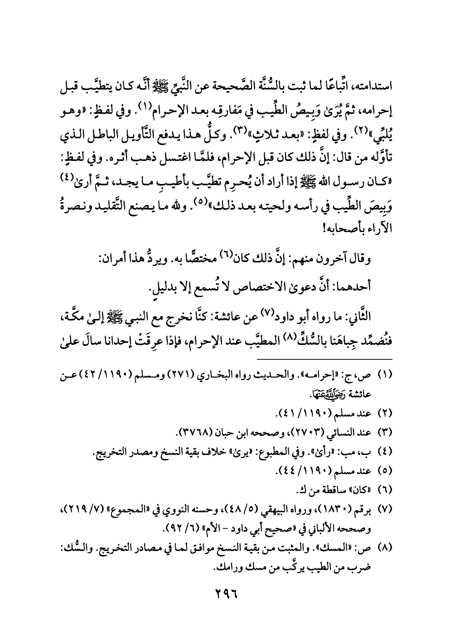 استدامته، اتِّباعًا لما ثبت بالسُّنَّة الصَّحيحة عن النَّبيِّ - صلى الله عليه وسلم - أنَّه كان يتطيَّب قبل إحرامه، ثمَّ يُرَى وَبِيصُ الطِّيب في مَفارقِه بعد الإحرام (¬١). وفي لفظٍ: «وهو يُلبِّي» (¬٢). وفي لفظٍ: «بعد ثلاثٍ» (¬٣). وكلُّ هذا يدفع التَّأويل الباطل الذي تأوَّله من قال: إنَّ ذلك كان قبل الإحرام، فلمَّا اغتسل ذهب أثره. وفي لفظٍ: «كان رسول الله - صلى الله عليه وسلم - إذا أراد أن يُحرِم تطيَّب بأطيبِ ما يجد، ثمَّ أرى (¬٤) وَبِيصَ الطِّيب في رأسه ولحيته بعد ذلك» (¬٥). وللَّه ما يصنع التَّقليد ونصرةُ الآراء بأصحابه!