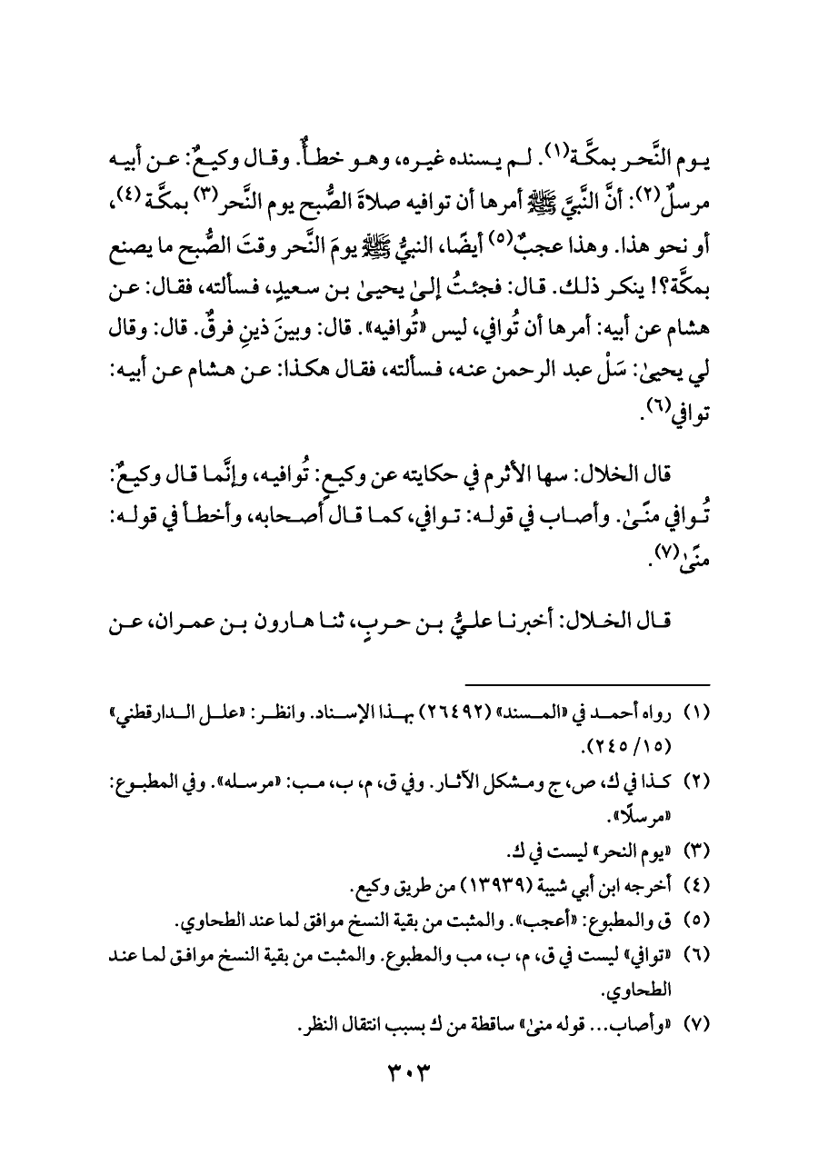 قال الخلال: سها الأثرم في حكايته عن وكيعٍ: تُوافيه، وإنَّما قال وكيعٌ: تُوافي منًى. وأصاب في قوله: توافي، كما قال أصحابه، وأخطأ في قوله: منًى (¬٧).