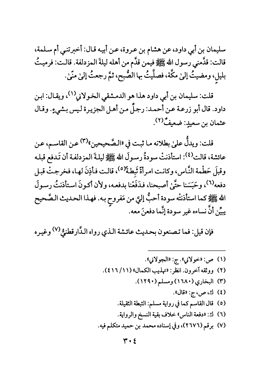 قلت: ويدلُّ على بطلانه ما ثبت في «الصَّحيحين» (¬٣) عن القاسم، عن عائشة، قالت (¬٤): استأذنتْ سودةُ رسولَ الله - صلى الله عليه وسلم - ليلةَ المزدلفة أن تَدفع قبله وقبلَ حَطْمة النَّاس، وكانت امرأةً ثَبِطةً (¬٥)، قالت فأذِنَ لها، فخرجتْ قبل دفعه (¬٦)، وحَبَسَنا حتَّى أصبحنا، فدَفَعْنا بدفعه، ولأن أكونَ استأذنتُ رسولَ الله - صلى الله عليه وسلم - كما استأذنتْه سودة أحبُّ إليَّ من مَفروحٍ به. فهذا الحديث الصَّحيح يبيِّن أنَّ نساءه غير سودة إنَّما دفعنَ معه.