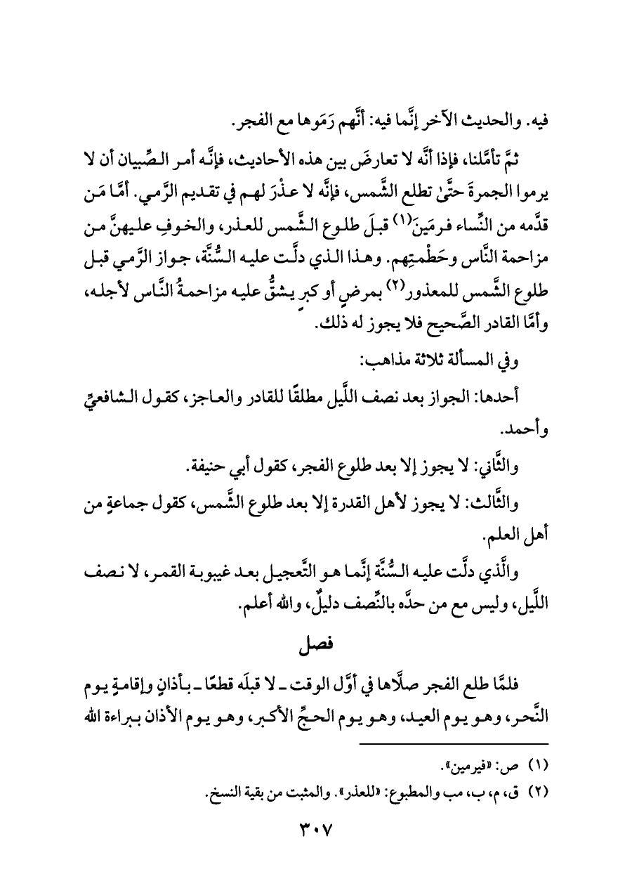 ثمَّ تأمَّلنا، فإذا أنَّه لا تعارضَ بين هذه الأحاديث، فإنَّه أمر الصِّبيان أن لا يرموا الجمرةَ حتَّى تطلع الشَّمس، فإنَّه لا عذْرَ لهم في تقديم الرَّمي. أمَّا مَن قدَّمه من النِّساء فرمَينَ (¬١) قبلَ طلوع الشَّمس للعذر، والخوفِ عليهنَّ من مزاحمة النَّاس وحَطْمتِهم. وهذا الذي دلَّت عليه السُّنَّة، جواز الرَّمي قبل طلوع الشَّمس للمعذور (¬٢) بمرضٍ أو كبرٍ يشقُّ عليه مزاحمةُ النَّاس لأجله، وأمَّا القادر الصَّحيح فلا يجوز له ذلك.