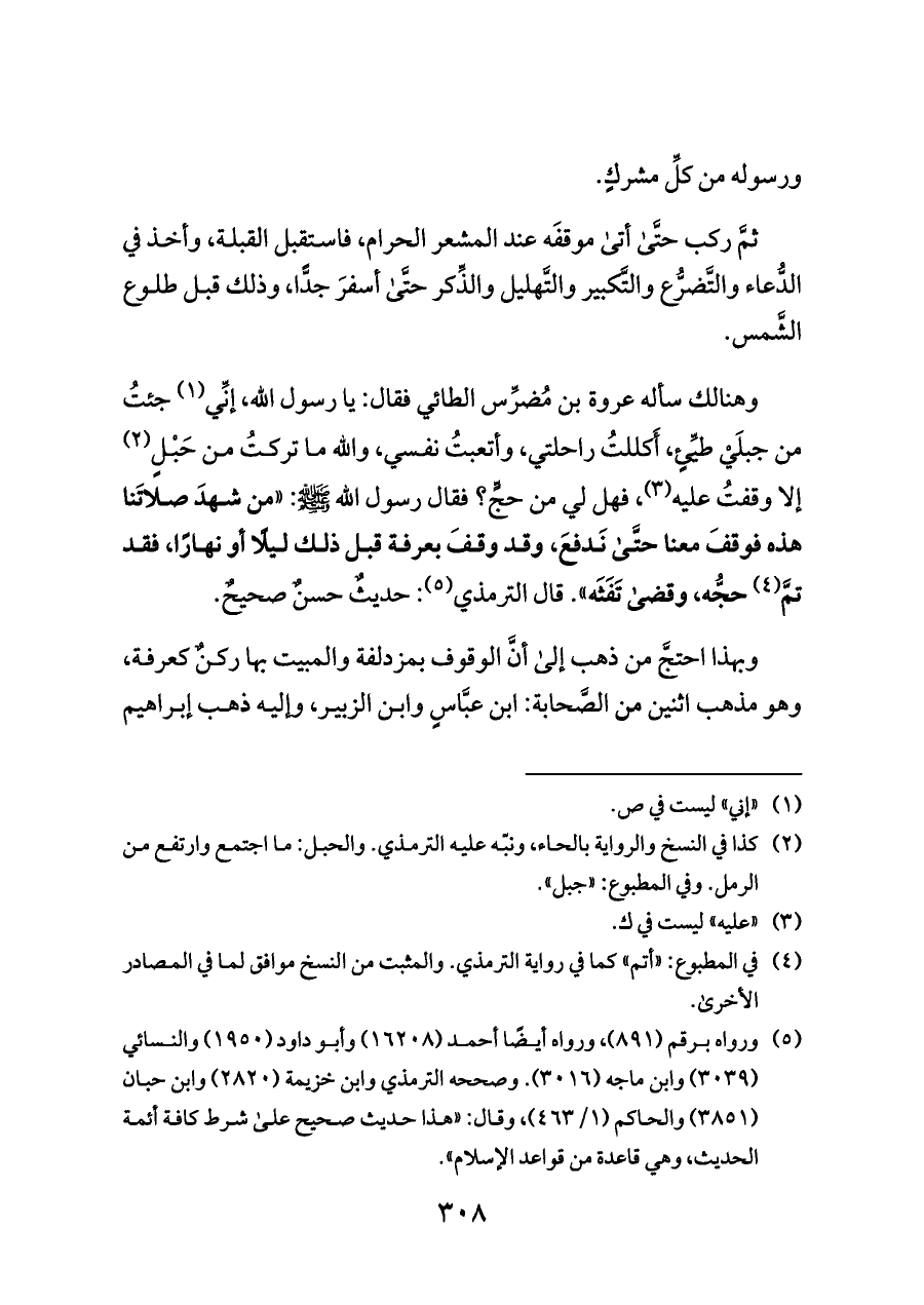 وهنالك سأله عروة بن مُضرِّس الطائي فقال: يا رسول الله, إنِّي (¬١) جئتُ من جبلَيْ طيِّئٍ، أَكللتُ راحلتي، وأتعبتُ نفسي، والله ما تركتُ من حَبْلٍ (¬٢) إلا وقفتُ عليه (¬٣)، فهل لي من حجٍّ؟ فقال رسول الله - صلى الله عليه وسلم -: «من شهدَ صلاتَنا هذه فوقفَ معنا حتَّى نَدفعَ، وقد وقفَ بعرفة قبل ذلك ليلًا أو نهارًا، فقد تمَّ (¬٤) حجُّه، وقضى تَفَثَه». قال الترمذي (¬٥): حديثٌ حسنٌ صحيحٌ.