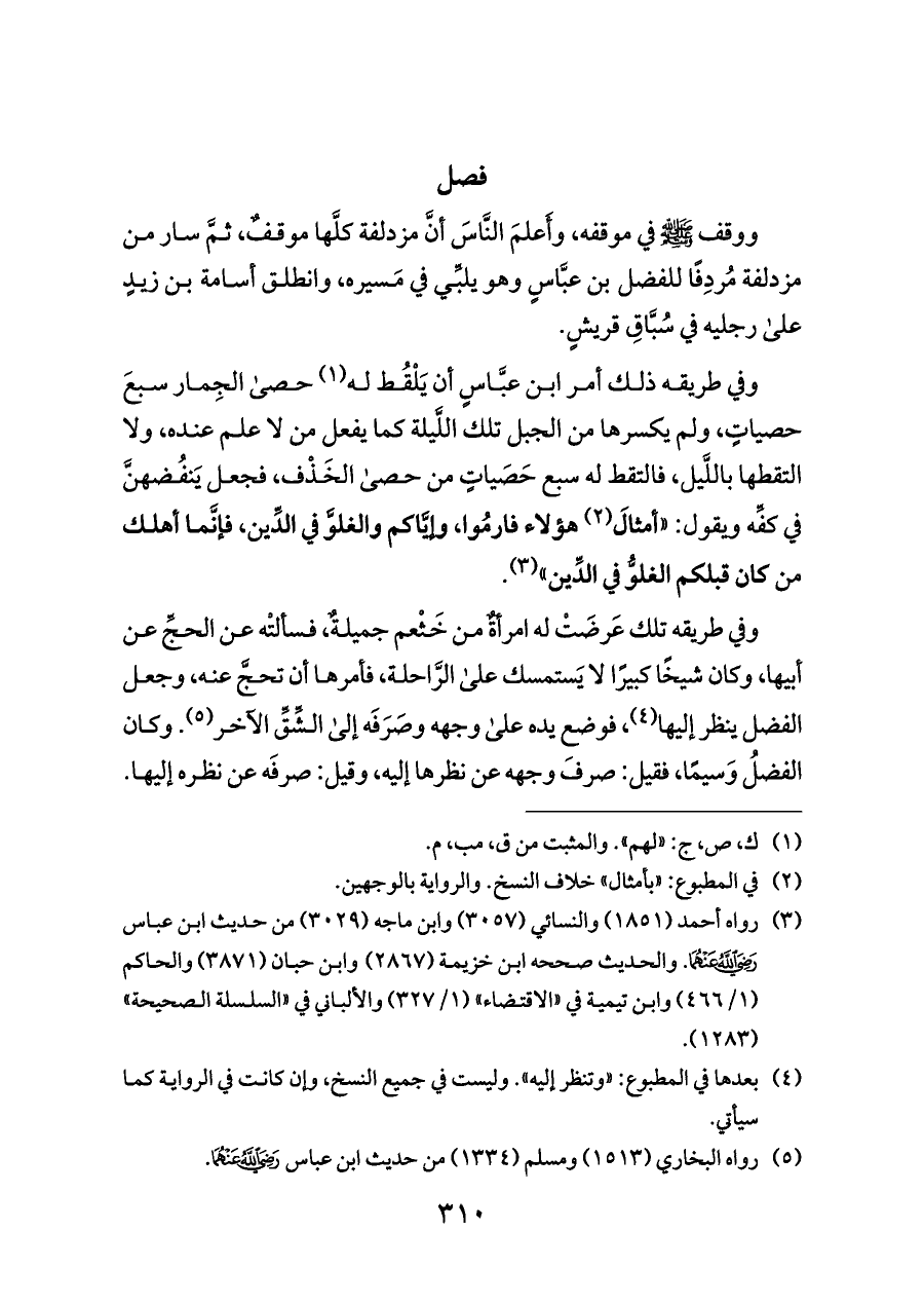 وفي طريقه ذلك أمر ابن عبَّاسٍ أن يَلْقُط له (¬١) حصى الجِمار سبعَ حصياتٍ، ولم يكسرها من الجبل تلك اللَّيلة كما يفعل من لا علم عنده، ولا التقطها باللَّيل، فالتقط له سبع حَصَياتٍ من حصى الخَذْف، فجعل يَنفُضهنَّ في كفِّه ويقول: «أمثالَ (¬٢) هؤلاء فارمُوا، وإيَّاكم والغلوَّ في الدِّين، فإنَّما أهلك من كان قبلكم الغلوُّ في الدِّين» (¬٣).
