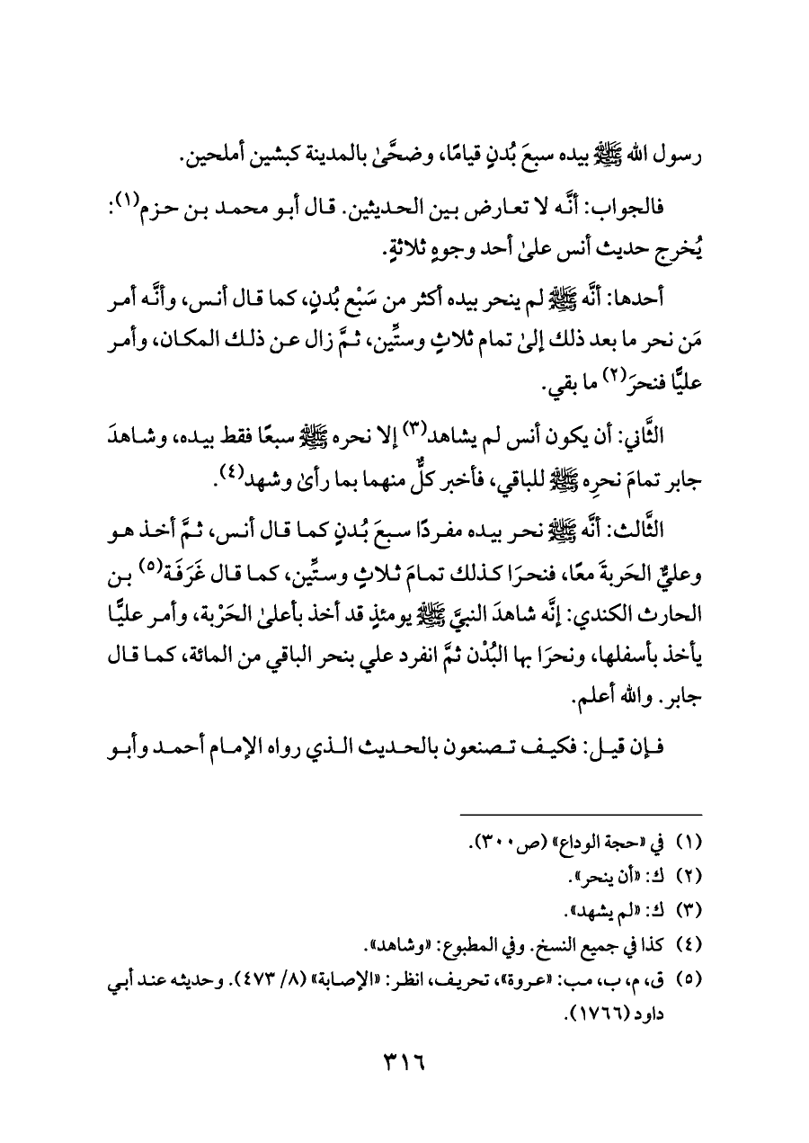 الثَّاني: أن يكون أنس لم يشاهد (¬٣) إلا نحره - صلى الله عليه وسلم - سبعًا فقط بيده، وشاهدَ جابر تمامَ نحرِه - صلى الله عليه وسلم - للباقي، فأخبر كلٌّ منهما بما رأى وشهد (¬٤).