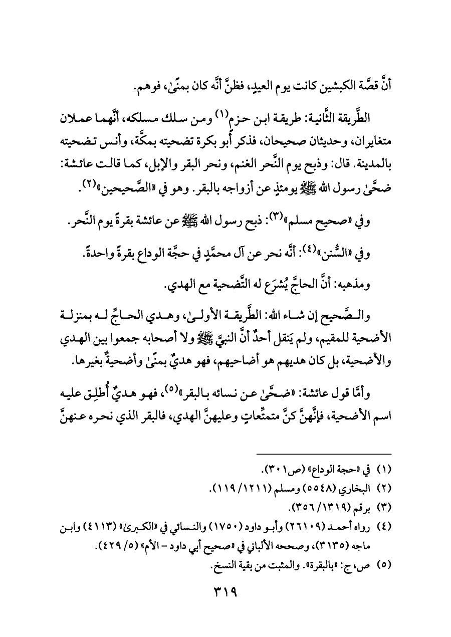 الطَّريقة الثَّانية: طريقة ابن حزمٍ (¬١) ومن سلك مسلكه، أنَّهما عملان متغايران، وحديثان صحيحان، فذكر أبو بكرة تضحيته بمكَّة، وأنس تضحيته بالمدينة. قال: وذبح يوم النَّحر الغنم، ونحر البقر والإبل، كما قالت عائشة: ضحَّى رسول الله - صلى الله عليه وسلم - يومئذٍ عن أزواجه بالبقر. وهو في «الصَّحيحين» (¬٢).