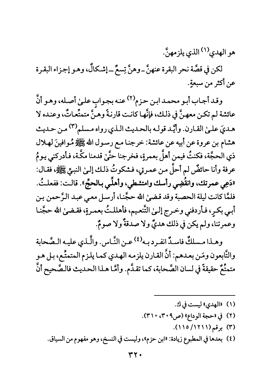 وقد أجاب أبو محمد ابن حزم (¬٢) عنه بجوابٍ على أصله، وهو أنَّ عائشة لم تكن معهنَّ في ذلك، فإنَّها كانت قارنةً وهنَّ متمتِّعاتٌ، وعنده لا هديَ على القارن. وأيَّد قوله بالحديث الذي رواه مسلم (¬٣) من حديث هشام بن عروة عن أبيه عن عائشة: خرجنا مع رسول الله - صلى الله عليه وسلم - مُوافينَ لهلال ذي الحجَّة، فكنتُ فيمن أهلَّ بعمرةٍ، فخرجنا حتَّى قدمنا مكَّة، فأدركني يومُ عرفة وأنا حائضٌ لم أحلَّ من عمرتي، فشكوتُ ذلك إلى النبيِّ - صلى الله عليه وسلم -، فقال: «دَعِي عمرتك، وانقُضِي رأسك وامتشطي، وأهلِّي بالحجِّ». قالت: ففعلتُ. فلمَّا كانت ليلة الحصبة وقد قضى الله حجَّنا، أرسل معي عبد الرَّحمن بن أبي بكرٍ، فأردفني وخرج إلى التَّنعيم، فأهللتُ بعمرةٍ، فقضى الله حجَّنا وعمرتنا، ولم يكن في ذلك هديٌ ولا صدقةٌ ولا صومٌ.