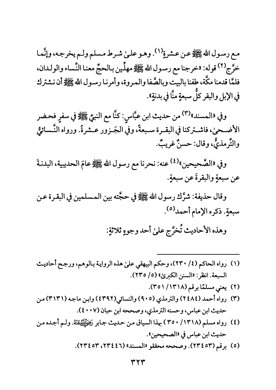 مع رسول الله - صلى الله عليه وسلم - عن عشرةٍ (¬١). وهو على شرط مسلم ولم يخرجه، وإنَّما خرَّج (¬٢) قوله: «خرجنا مع رسول الله - صلى الله عليه وسلم - مهلِّين بالحجِّ معنا النِّساء والولدان، فلمَّا قدمنا مكَّة، طفنا بالبيت وبالصَّفا والمروة، وأمرنا رسول الله - صلى الله عليه وسلم - أن نشترك في الإبل والبقر كلُّ سبعةٍ منَّا في بدنةٍ».
