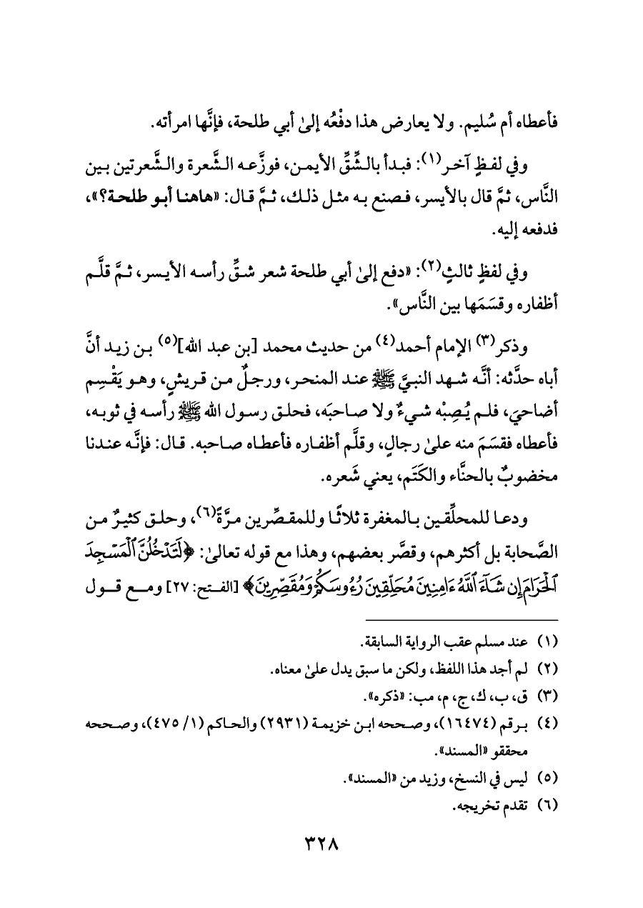 وذكر (¬٣) الإمام أحمد (¬٤) من حديث محمد [بن عبد الله] (¬٥) بن زيد أنَّ أباه حدَّثه: أنَّه شهد النبيَّ - صلى الله عليه وسلم - عند المنحر، ورجلٌ من قريشٍ، وهو يَقْسِم أضاحيَ، فلم يُصِبْه شيءٌ ولا صاحبَه، فحلق رسول الله - صلى الله عليه وسلم - رأسه في ثوبه، فأعطاه فقسَمَ منه على رجالٍ، وقلَّم أظفاره فأعطاه صاحبه. قال: فإنَّه عندنا مخضوبٌ بالحنَّاء والكَتَم، يعني شَعره.