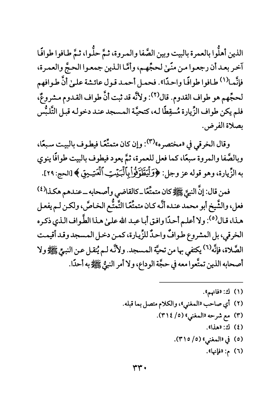 فمن قال: إنَّ النبيَّ - صلى الله عليه وسلم - كان متمتِّعًا ــ كالقاضي وأصحابه ــ عندهم هكذا (¬٤) فعل، والشَّيخ أبو محمد عنده أنَّه كان متمتِّعًا التَّمتُّع الخاصَّ، ولكن لم يفعل هذا، قال (¬٥): ولا أعلم أحدًا وافق أبا عبد الله على هذا الطَّواف الذي ذكره الخرقي، بل المشروع طوافٌ واحدٌ للزِّيارة، كمن دخل المسجد وقد أقيمت الصَّلاة، فإنَّه (¬٦) يكتفي بها من تحيَّة المسجد. ولأنَّه لم يُنقل عن النبيِّ - صلى الله عليه وسلم - ولا أصحابه الذين تمتَّعوا معه في حجَّة الوداع، ولا أمر النبيُّ - صلى الله عليه وسلم - به أحدًا.