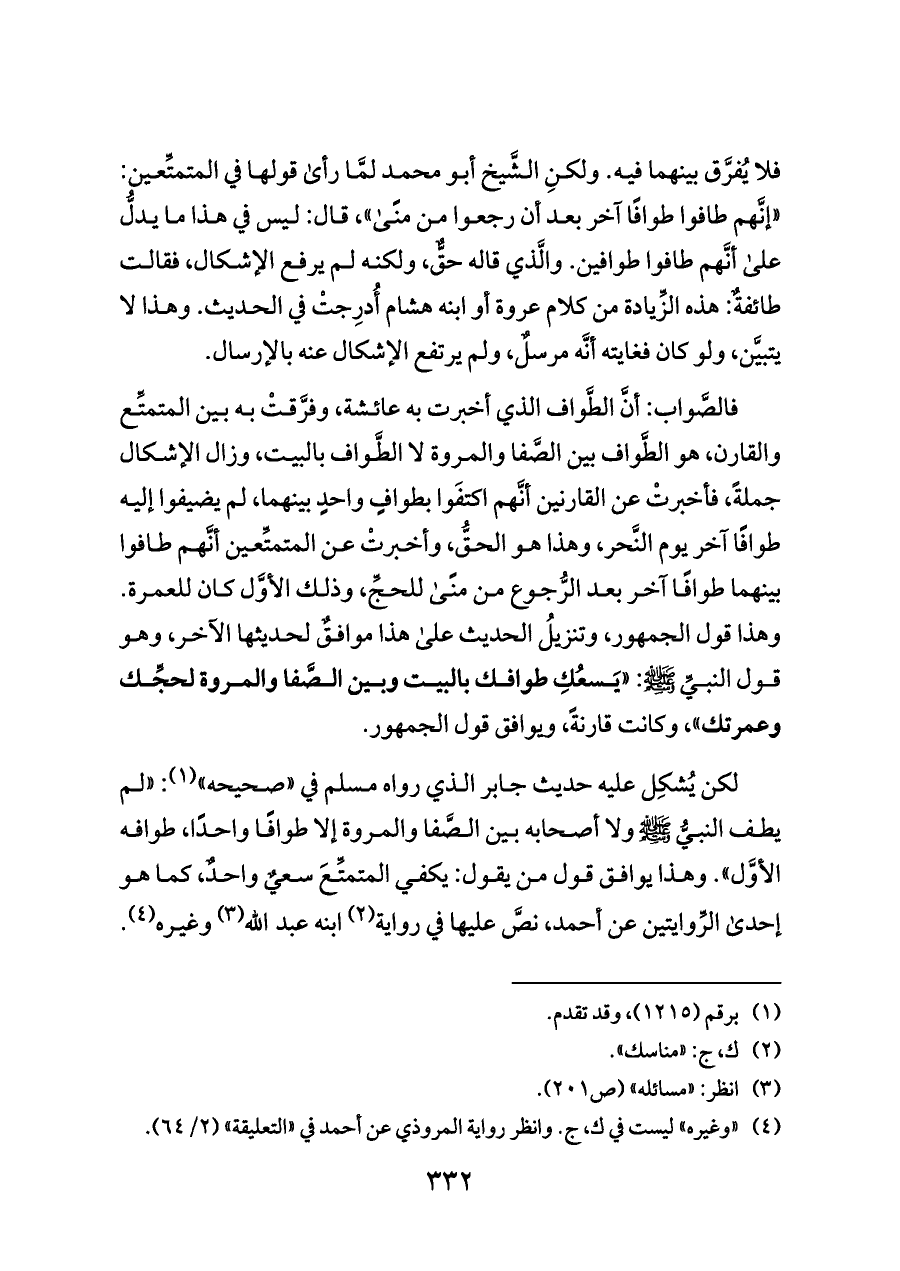 لكن يُشكِل عليه حديث جابر الذي رواه مسلم في «صحيحه» (¬١): «لم يطف النبيُّ - صلى الله عليه وسلم - ولا أصحابه بين الصَّفا والمروة إلا طوافًا واحدًا، طوافه الأوَّل». وهذا يوافق قول من يقول: يكفي المتمتِّعَ سعيٌ واحدٌ، كما هو إحدى الرِّوايتين عن أحمد، نصَّ عليها في رواية (¬٢) ابنه عبد الله (¬٣) وغيره (¬٤).