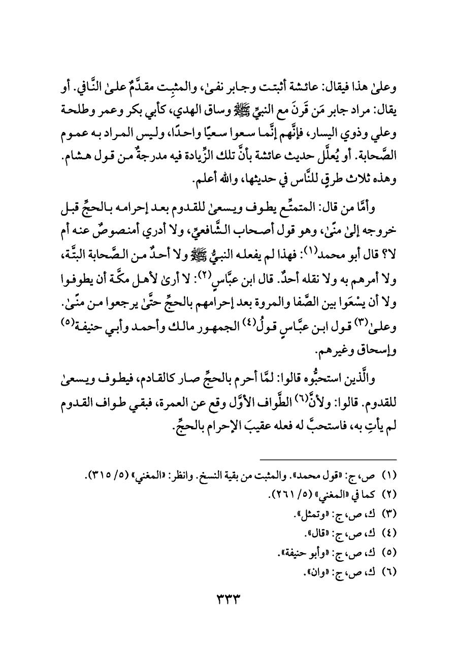 وعلى هذا فيقال: عائشة أثبتت وجابر نفى، والمثبِت مقدَّمٌ على النَّافي. أو يقال: مراد جابر مَن قَرنَ مع النبيِّ - صلى الله عليه وسلم - وساق الهدي، كأبي بكر وعمر وطلحة وعلي وذوي اليسار، فإنَّهم إنَّما سعوا سعيًا واحدًا، وليس المراد به عموم الصَّحابة. أو يُعلَّل حديث عائشة بأنَّ تلك الزِّيادة فيه مدرجةٌ من قول هشام. وهذه ثلاث طرقٍ للنَّاس في حديثها، والله أعلم.
