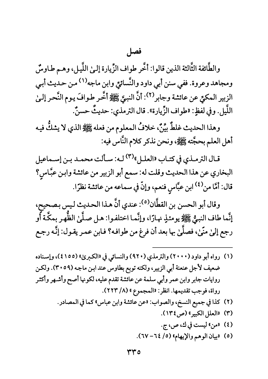 والطَّائفة الثَّالثة الذين قالوا: أخَّر طواف الزِّيارة إلى اللَّيل، وهم طاوسٌ ومجاهد وعروة. ففي سنن أبي داود والنَّسائيِّ وابن ماجه (¬١) من حديث أبي الزبير المكيِّ عن عائشة وجابر (¬٢): أنَّ النبيَّ - صلى الله عليه وسلم - أخَّر طوافَ يوم النَّحر إلى اللَّيل. وفي لفظٍ: «طواف الزِّيارة». قال الترمذي: حديثٌ حسنٌ.