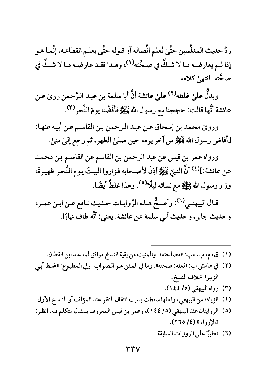 ويدلُّ على غلطه (¬٢) على عائشة أنَّ أبا سلمة بن عبد الرَّحمن روى عن عائشة أنَّها قالت: حججنا مع رسول الله - صلى الله عليه وسلم - فأفَضْنا يومَ النَّحر (¬٣).