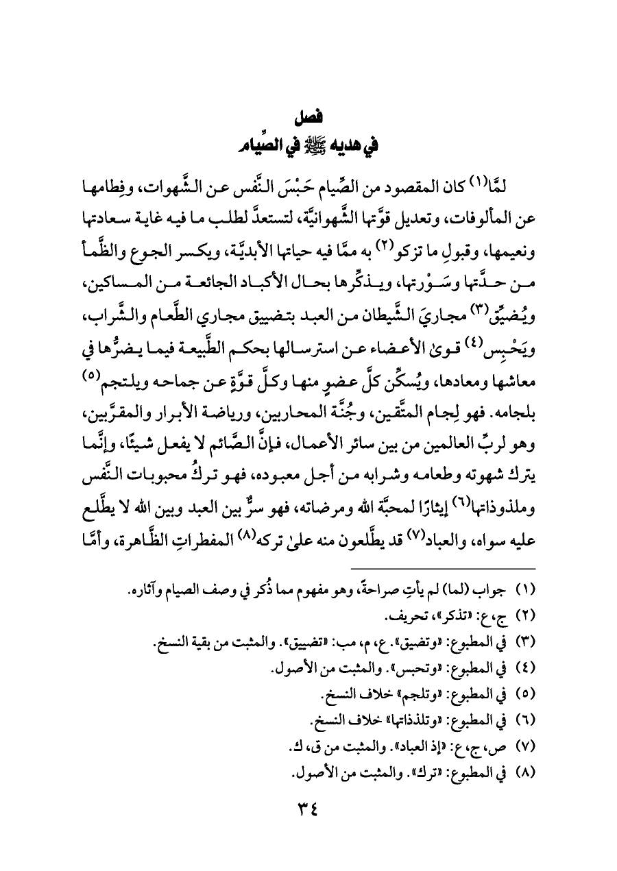 لمَّا (¬١) كان المقصود من الصِّيام حَبْسَ النَّفس عن الشَّهوات، وفِطامها عن المألوفات، وتعديل قوَّتها الشَّهوانيَّة، لتستعدَّ لطلب ما فيه غاية سعادتها ونعيمها، وقبولِ ما تزكو (¬٢) به ممَّا فيه حياتها الأبديَّة، ويكسر الجوع والظَّمأ من حدَّتها وسَوْرتها، ويذكِّرها بحال الأكباد الجائعة من المساكين، ويُضيِّق (¬٣) مجاريَ الشَّيطان من العبد بتضييق مجاري الطَّعام والشَّراب، ويَحْبِس (¬٤) قوى الأعضاء عن استرسالها بحكم الطَّبيعة فيما يضرُّها في معاشها ومعادها، ويُسكِّن كلَّ عضوٍ منها وكلَّ قوَّةٍ عن جماحه ويلتجم (¬٥) بلجامه. فهو لِجام المتَّقين، وجُنَّة المحاربين، ورياضة الأبرار والمقرَّبين، وهو لربِّ العالمين من بين سائر الأعمال، فإنَّ الصَّائم لا يفعل شيئًا، وإنَّما يترك شهوته وطعامه وشرابه من أجل معبوده، فهو تركُ محبوبات النَّفس وملذوذاتها (¬٦) إيثارًا لمحبَّة الله ومرضاته، فهو سرٌّ بين العبد وبين الله لا يطَّلع عليه سواه، والعباد (¬٧) قد يطَّلعون منه على تركه (¬٨) المفطراتِ الظَّاهرة، وأمَّا