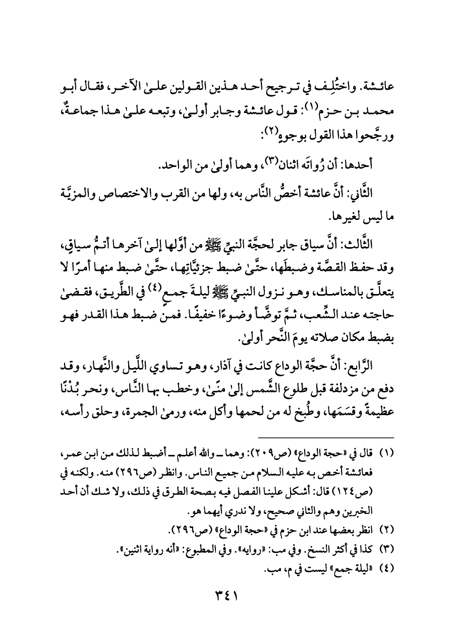 (¬١) قال في «حجة الوداع» (ص ٢٠٩): وهما ــ والله أعلم ــ أضبط لذلك من ابن عمر، فعائشة أخص به عليه السلام من جميع الناس. وانظر (ص ٢٩٦) منه. ولكنه في (ص ١٢٤) قال: أشكل علينا الفصل فيه بصحة الطرق في ذلك، ولا شك أن أحد الخبرين وهم والثاني صحيح، ولا ندري أيهما هو.