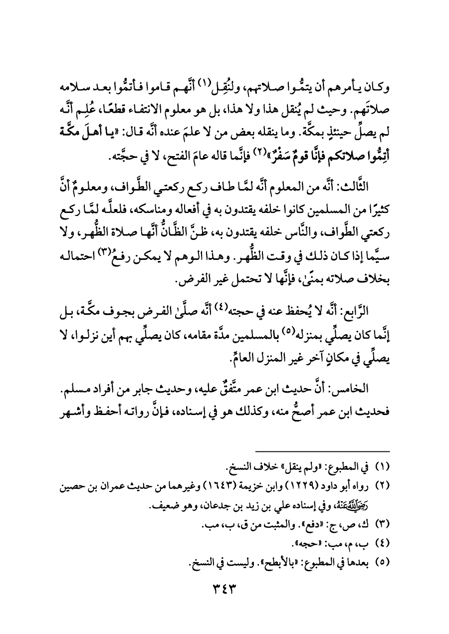الثَّالث: أنَّه من المعلوم أنَّه لمَّا طاف ركع ركعتي الطَّواف، ومعلومٌ أنَّ كثيرًا من المسلمين كانوا خلفه يقتدون به في أفعاله ومناسكه، فلعلَّه لمَّا ركع ركعتي الطَّواف، والنَّاس خلفه يقتدون به، ظنَّ الظَّانُّ أنَّها صلاة الظُّهر، ولا سيَّما إذا كان ذلك في وقت الظُّهر. وهذا الوهم لا يمكن رفعُ (¬٣) احتماله بخلاف صلاته بمنًى، فإنَّها لا تحتمل غير الفرض.