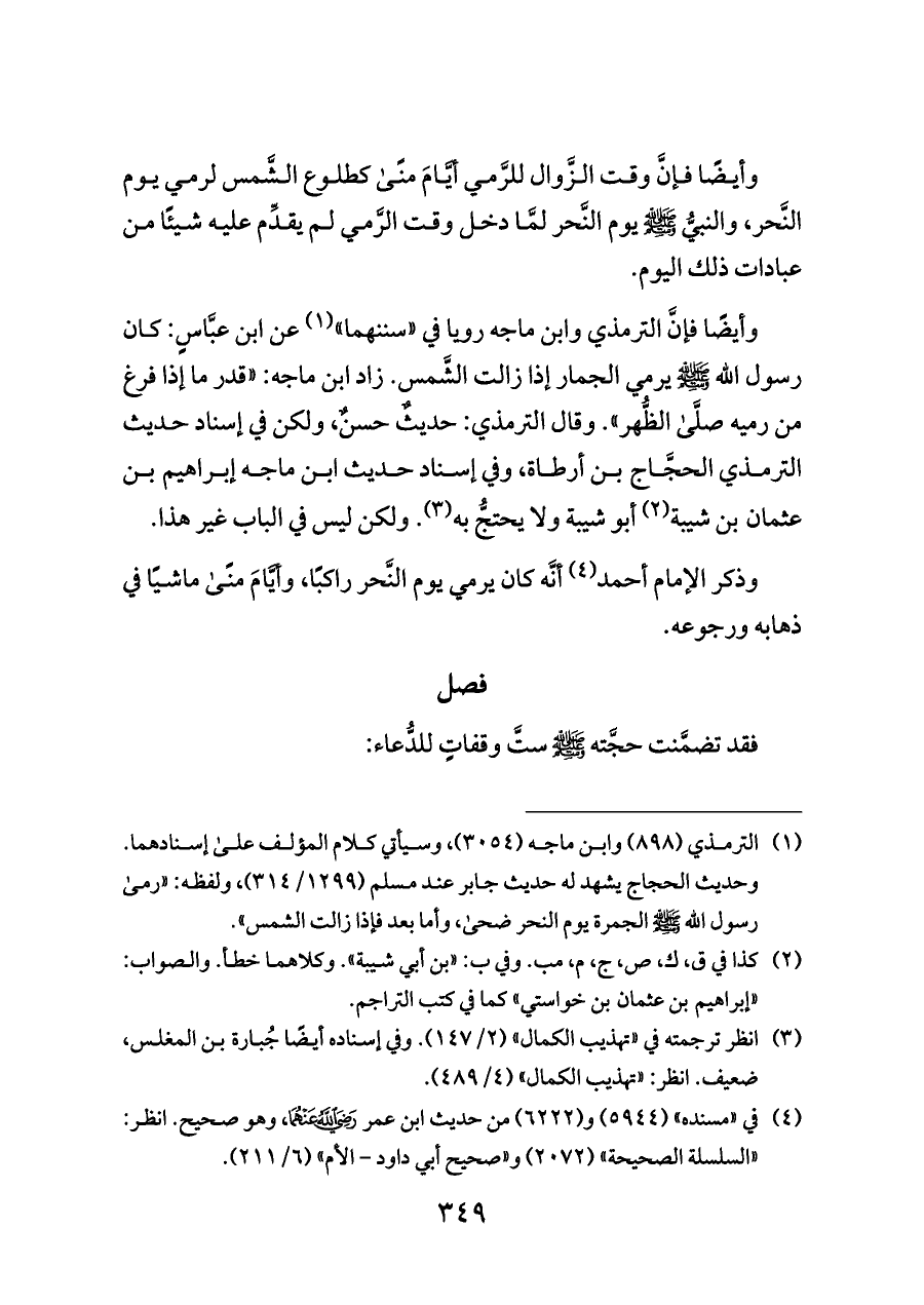 وأيضًا فإنَّ الترمذي وابن ماجه رويا في «سننهما» (¬١) عن ابن عبَّاسٍ: كان رسول الله - صلى الله عليه وسلم - يرمي الجمار إذا زالت الشَّمس. زاد ابن ماجه: «قدر ما إذا فرغ من رميه صلَّى الظُّهر». وقال الترمذي: حديثٌ حسنٌ، ولكن في إسناد حديث الترمذي الحجَّاج بن أرطاة، وفي إسناد حديث ابن ماجه إبراهيم بن عثمان بن شيبة (¬٢) أبو شيبة ولا يحتجُّ به (¬٣). ولكن ليس في الباب غير هذا.